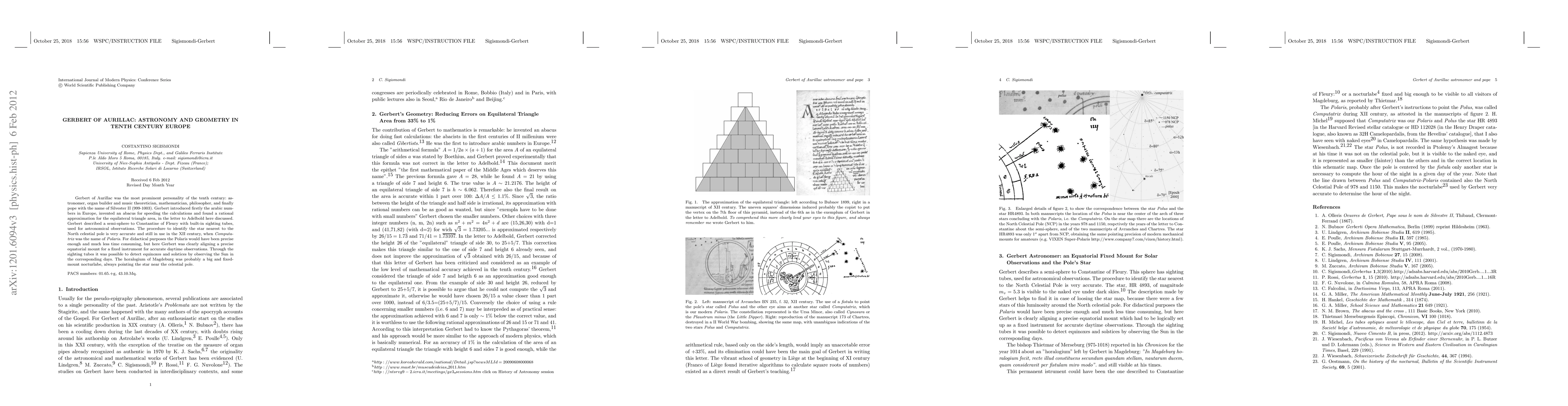 Gerbert of Aurillac was the most prominent personality of the tenth century: astronomer, organ builder and music theoretician, mathematician, philosopher, and finally pope with the name of Silvester II (999-1003). Gerbert introduced firstly the arabic numbers in Europe, invented an abacus for speeding the calculations and found a rational approximation for the equilateral triangle area, in the letter to Adelbold here discussed. Gerbert described a semi-sphere to Constantine of Fleury with built-in sighting tubes, used for astronomical observations. The procedure to identify the star nearest to the North celestial pole is very accurate and still in use in the XII century, when "Computatrix" was the name of Polaris. For didactical purposes the Polaris would have been precise enough and much less time consuming, but here Gerbert was clearly aligning a precise equatorial mount for a fixed instrument for accurate daytime observations. Through the sighting tubes it was possible to detect equinoxes and solstices by observing the Sun in the corresponding days. The horalogium of Magdeburg was probably a big and fixed-mount nocturlabe, always pointing the star near the celestial pole.