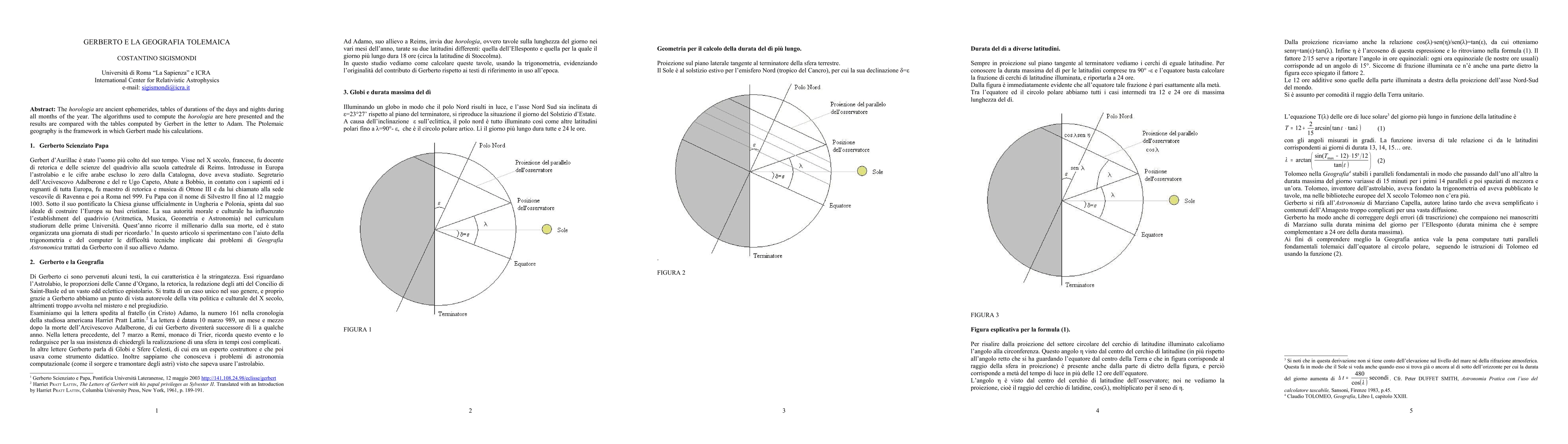 The horologia are ancient ephemerides, tables of durations of the days and nights during all months of the year. The algorithms used to compute the horologia are here presented and the results are compared with the tables computed by Gerbert in the letter to Adam. The Ptolemaic geography is the framework in which Gerbert made his calculations.