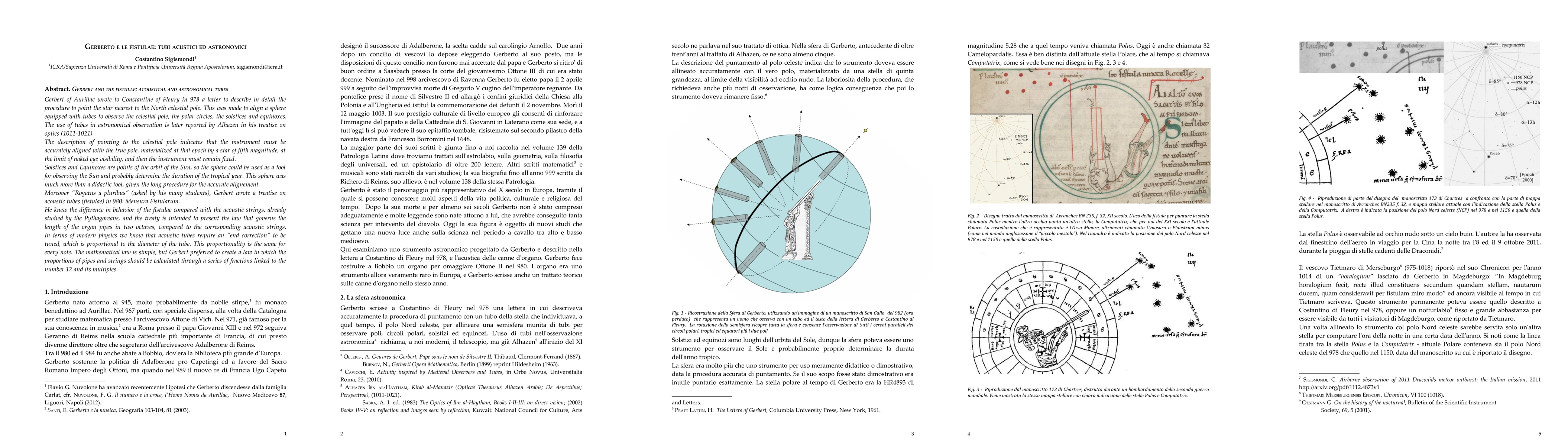 Gerbert of Aurillac wrote to Constantine of Fleury in 978 a letter to describe in detail the procedure to point the star nearest to the North celestial pole. This was made to align a sphere equipped with tubes to observe the celestial pole, the polar circles, the solstices and equinoxes. The use of tubes in astronomical observation is later reported by Alhazen in his treatise on optics (1011-1021). The description of pointing to the celestial pole indicates that the instrument must be accurately aligned with the true pole, materialized at that epoch by a star of fifth magnitude, at the limit of naked eye visibility, and then the instrument must remain fixed. Solstices and Equinoxes are points of the orbit of the Sun, so the sphere could be used as a tool for observing the Sun and probably determine the duration of the tropical year. This sphere was much more than a didactic tool, given the long procedure for the accurate alignement. Moreover "Rogatus a pluribus" (asked by his many students), Gerbert wrote a treatise on acoustic tubes (fistulae) in 980: Mensura Fistularum. He knew the difference in behavior of the fistulae compared with the acoustic strings, already studied by the Pythagoreans, and the treaty is intended to present the law that governs the length of the organ pipes in two octaves, compared to the corresponding acoustic strings. In terms of modern physics we know that acoustic tubes require an "end correction" to be tuned, which is proportional to the diameter of the tube. This proportionality is the same for every note. The mathematical law is simple, but Gerbert preferred to create a law in which the proportions of pipes and strings should be calculated through a series of fractions linked to the number 12 and its multiples.