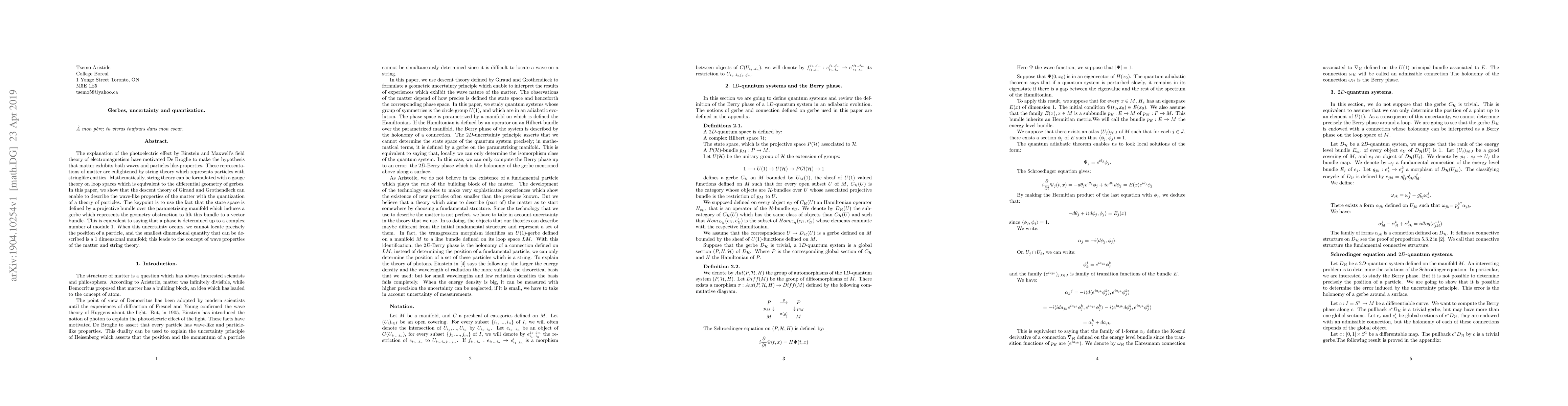 Researchers used a mathematical framework to describe how matter can exhibit both wave-like and particle-like properties, revealing the uncertainty principle in its quantization. This work connects string theory with concepts of gerbes, showing that particle position is not precisely determinable.
