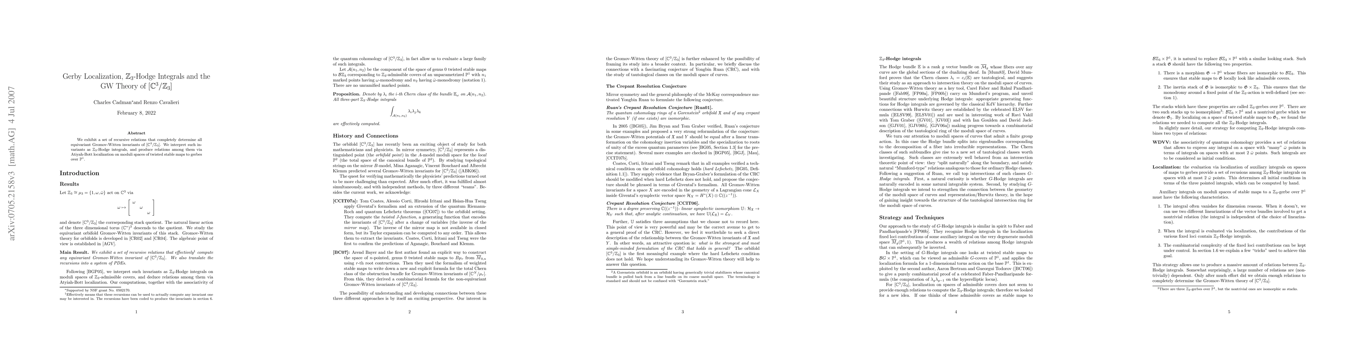 We exhibit a set of recursive relations that completely determine all equivariant Gromov-Witten invariants of the quotient orbifold C^3/Z_3. We interpret such invariants as G-Hodge Integrals, and produce relations among them via Atiyah-Bott localization on moduli spaces of twisted stable maps to gerbes over the projective line.