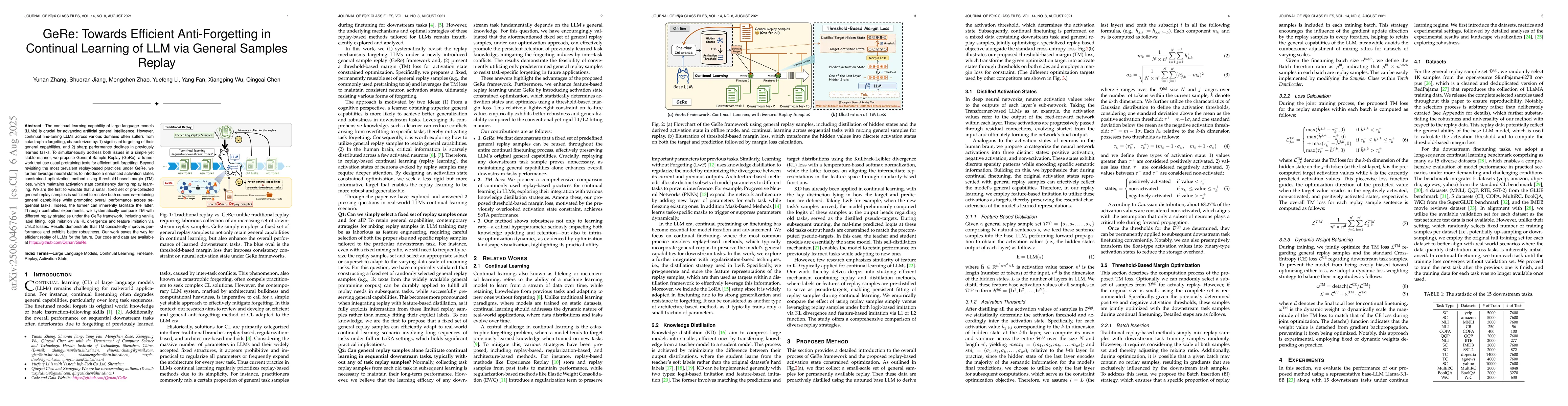 The continual learning capability of large language models (LLMs) is crucial for advancing artificial general intelligence. However, continual fine-tuning LLMs across various domains often suffers from catastrophic forgetting, characterized by: 1) significant forgetting of their general capabilities, and 2) sharp performance declines in previously learned tasks. To simultaneously address both issues in a simple yet stable manner, we propose General Sample Replay (GeRe), a framework that use usual pretraining texts for efficient anti-forgetting. Beyond revisiting the most prevalent replay-based practices under GeRe, we further leverage neural states to introduce a enhanced activation states constrained optimization method using threshold-based margin (TM) loss, which maintains activation state consistency during replay learning. We are the first to validate that a small, fixed set of pre-collected general replay samples is sufficient to resolve both concerns--retaining general capabilities while promoting overall performance across sequential tasks. Indeed, the former can inherently facilitate the latter. Through controlled experiments, we systematically compare TM with different replay strategies under the GeRe framework, including vanilla label fitting, logit imitation via KL divergence and feature imitation via L1/L2 losses. Results demonstrate that TM consistently improves performance and exhibits better robustness. Our work paves the way for efficient replay of LLMs for the future. Our code and data are available at https://github.com/Qznan/GeRe.