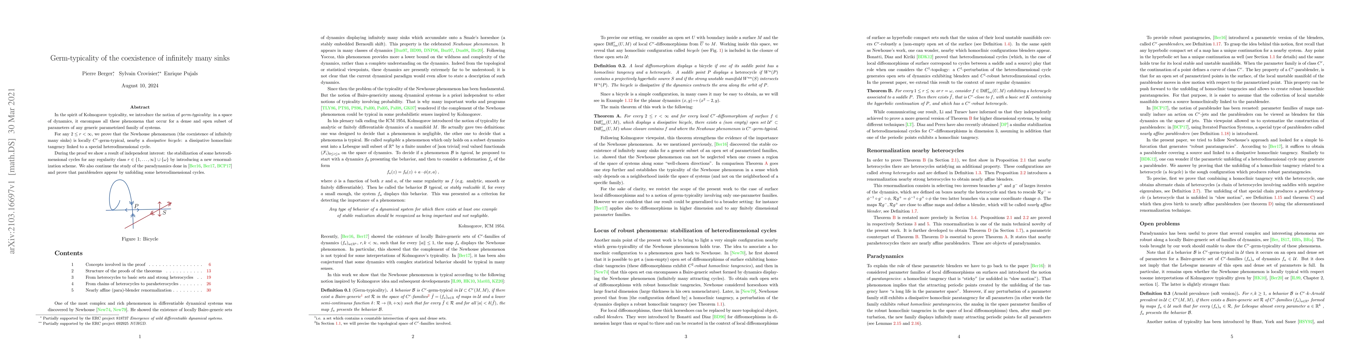 This paper introduces the concept of germ-typicality in dynamical systems, demonstrating that the coexistence of infinitely many sinks (Newhouse phenomenon) is locally typical near a dissipative bicycle. The study also presents a new renormalization scheme for stabilizing heterodimensional cycles and reveals the emergence of parablenders from heterodimensional cycle unfoldings.