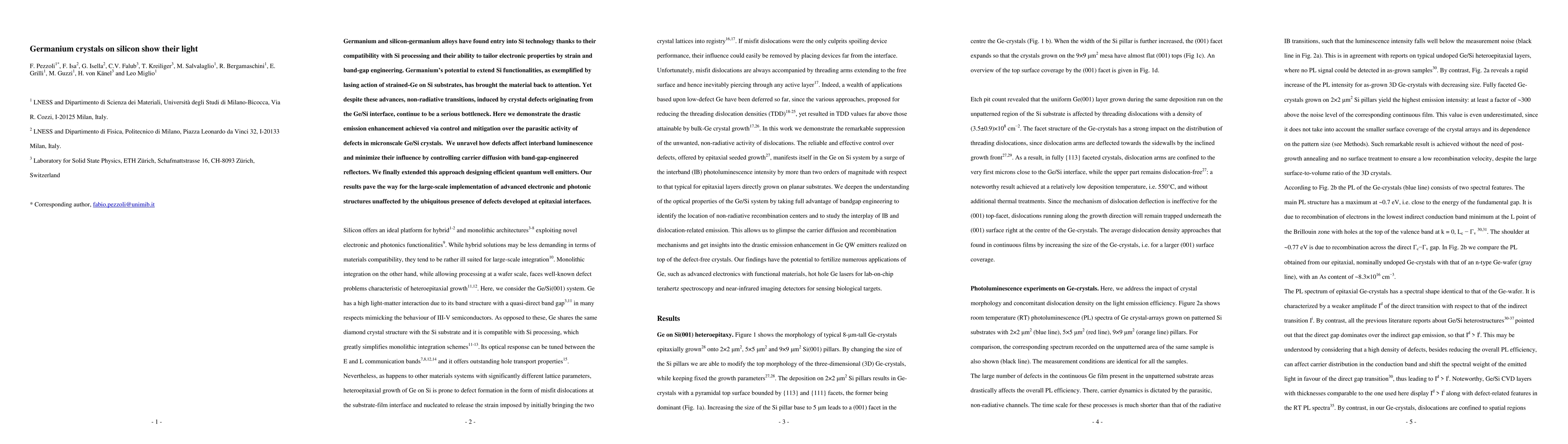 Germanium and silicon-germanium alloys have found entry into Si technology thanks to their compatibility with Si processing and their ability to tailor electronic properties by strain and band-gap engineering. Germanium's potential to extend Si functionalities, as exemplified by lasing action of strained-Ge on Si substrates, has brought the material back to attention. Yet despite these advances, non-radiative transitions, induced by crystal defects originating from the Ge/Si interface, continue to be a serious bottleneck. Here we demonstrate the drastic emission enhancement achieved via control and mitigation over the parasitic activity of defects in micronscale Ge/Si crystals. We unravel how defects affect interband luminescence and minimize their influence by controlling carrier diffusion with band-gap-engineered reflectors. We finally extended this approach designing efficient quantum well emitters. Our results pave the way for the large-scale implementation of advanced electronic and photonic structures unaffected by the ubiquitous presence of defects developed at epitaxial interfaces.