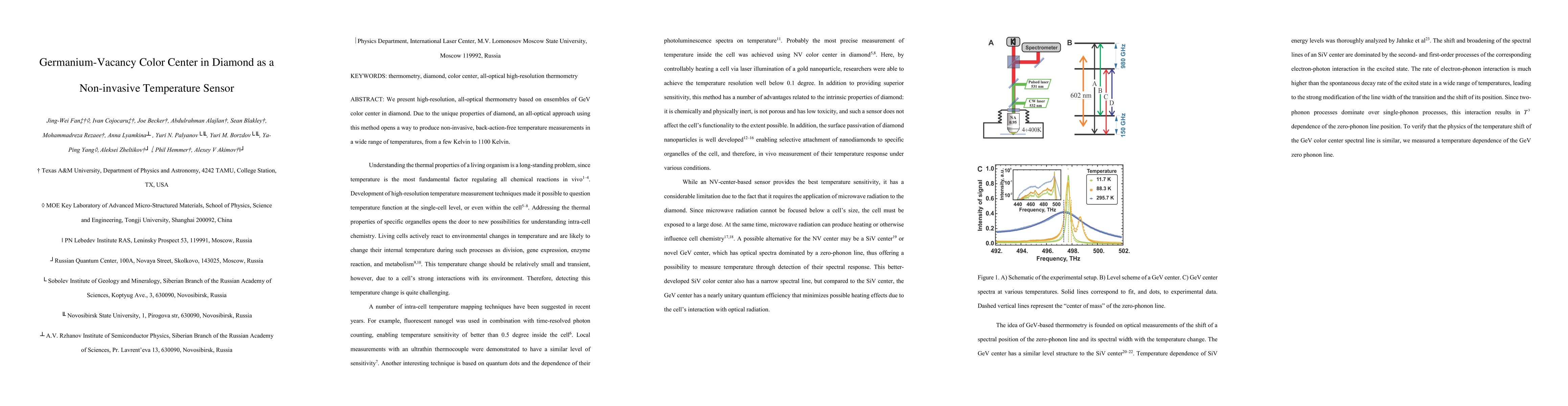 This paper introduces a high-resolution, all-optical thermometry technique using Germanium-Vacancy (GeV) color centers in diamond for non-invasive temperature measurements across a broad temperature range from a few Kelvin to 1100 Kelvin. This method leverages the unique properties of diamond to achieve back-action-free temperature sensing.