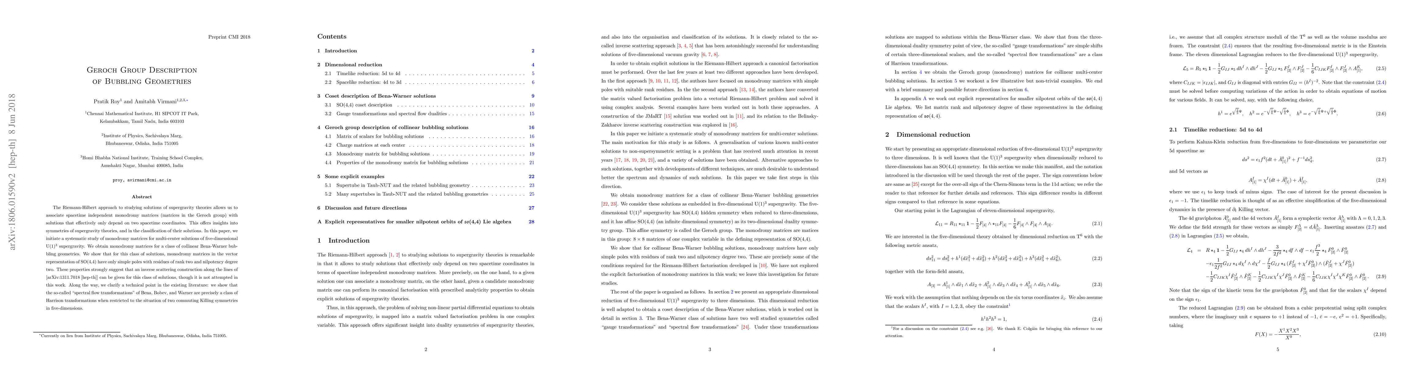 The Riemann-Hilbert approach to studying solutions of supergravity theories allows us to associate spacetime independent monodromy matrices (matrices in the Geroch group) with solutions that effectively only depend on two spacetime coordinates. This offers insights into symmetries of supergravity theories, and in the classification of their solutions. In this paper, we initiate a systematic study of monodromy matrices for multi-center solutions of five-dimensional U(1)$^3$ supergravity. We obtain monodromy matrices for a class of collinear Bena-Warner bubbling geometries. We show that for this class of solutions, monodromy matrices in the vector representation of SO(4,4) have only simple poles with residues of rank two and nilpotency degree two. These properties strongly suggest that an inverse scattering construction along the lines of [arXiv:1311.7018 [hep-th]] can be given for this class of solutions, though it is not attempted in this work. Along the way, we clarify a technical point in the existing literature: we show that the so-called "spectral flow transformations" of Bena, Bobev, and Warner are precisely a class of Harrison transformations when restricted to the situation of two commuting Killing symmetries in five-dimensions.