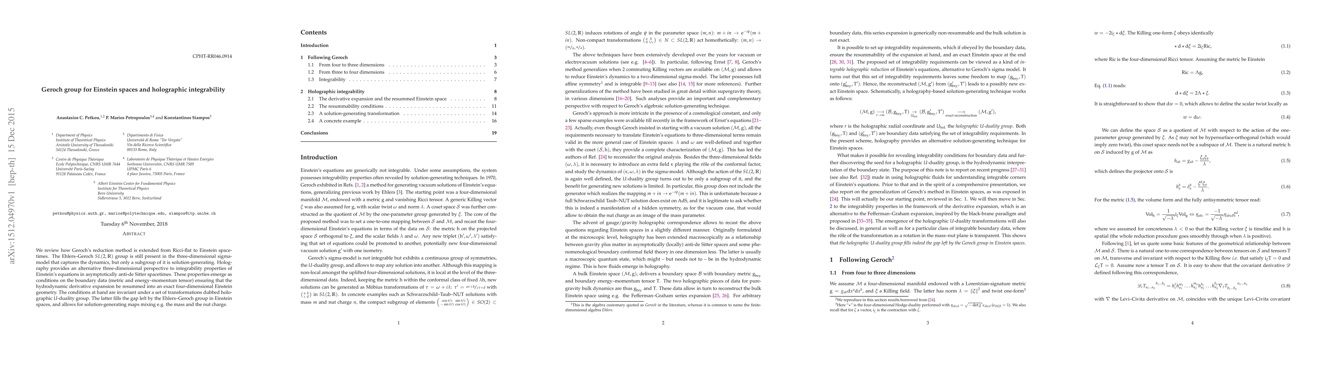 We review how Geroch's reduction method is extended from Ricci-flat to Einstein spacetimes. The Ehlers-Geroch SL(2,R) group is still present in the three-dimensional sigma-model that captures the dynamics, but only a subgroup of it is solution-generating. Holography provides an alternative three-dimensional perspective to integrability properties of Einstein's equations in asymptotically anti-de Sitter spacetimes. These properties emerge as conditions on the boundary data (metric and energy-momentum tensor) ensuring that the hydrodynamic derivative expansion be resummed into an exact four-dimensional Einstein geometry. The conditions at hand are invariant under a set of transformations dubbed holographic U-duality group. The latter fills the gap left by the Ehlers-Geroch group in Einstein spaces, and allows for solution-generating maps mixing e.g. the mass and the nut charge.