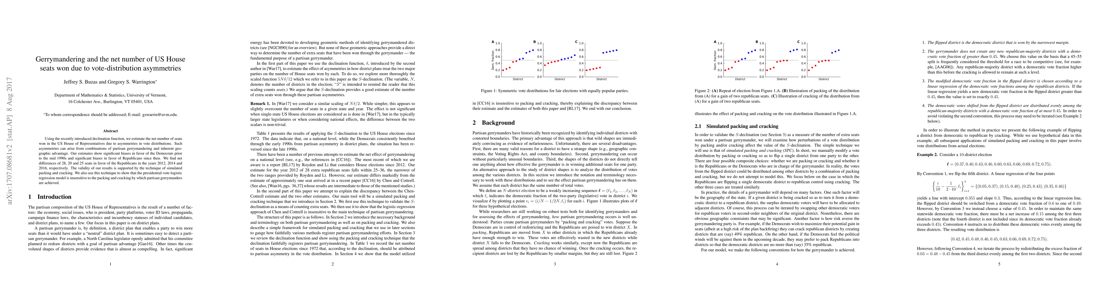 Using the recently introduced declination function, we estimate the net number of seats won in the US House of Representatives due to asymmetries in vote distributions. Such asymmetries can arise from combinations of partisan gerrymandering and inherent geographic advantage. Our estimates show significant biases in favor of the Democrats prior to the mid 1990s and significant biases in favor of Republicans since then. We find net differences of 28, 20 and 25 seats in favor of the Republicans in the years 2012, 2014 and 2016, respectively. The validity of our results is supported by the technique of simulated packing and cracking. We also use this technique to show that the presidential-vote logistic regression model is insensitive to the packing and cracking by which partisan gerrymanders are achieved.