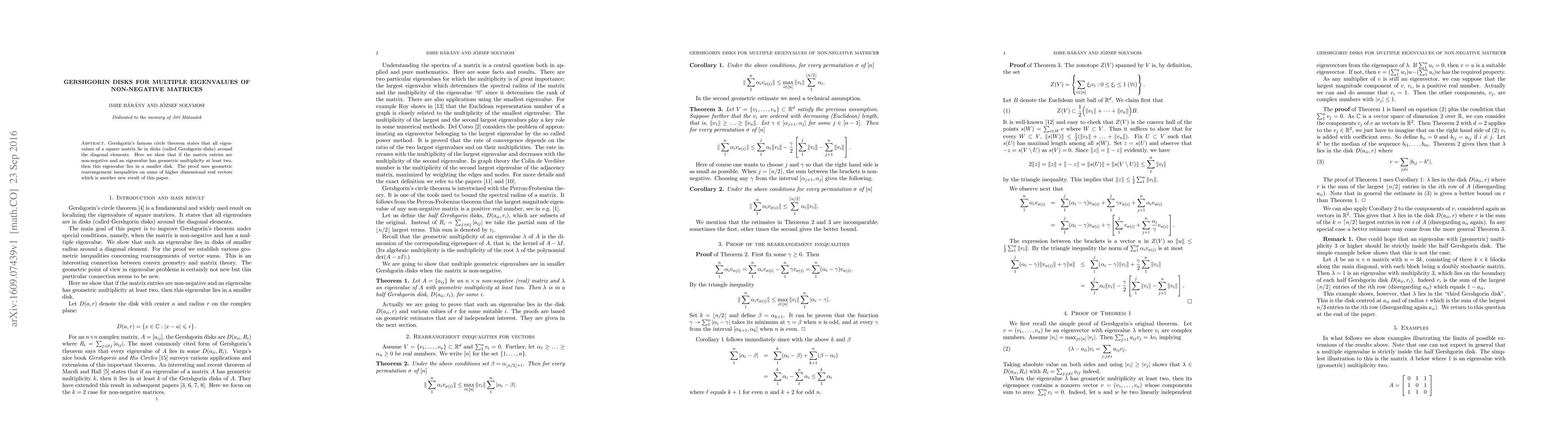 Gershgorin's famous circle theorem states that all eigenvalues of a square matrix lie in disks (called Gershgorin disks) around the diagonal elements. Here we show that if the matrix entries are non-negative and an eigenvalue has geometric multiplicity at least two, then this eigenvalue lies in a smaller disk. The proof uses geometric rearrangement inequalities on sums of higher dimensional real vectors which is another new result of this paper.