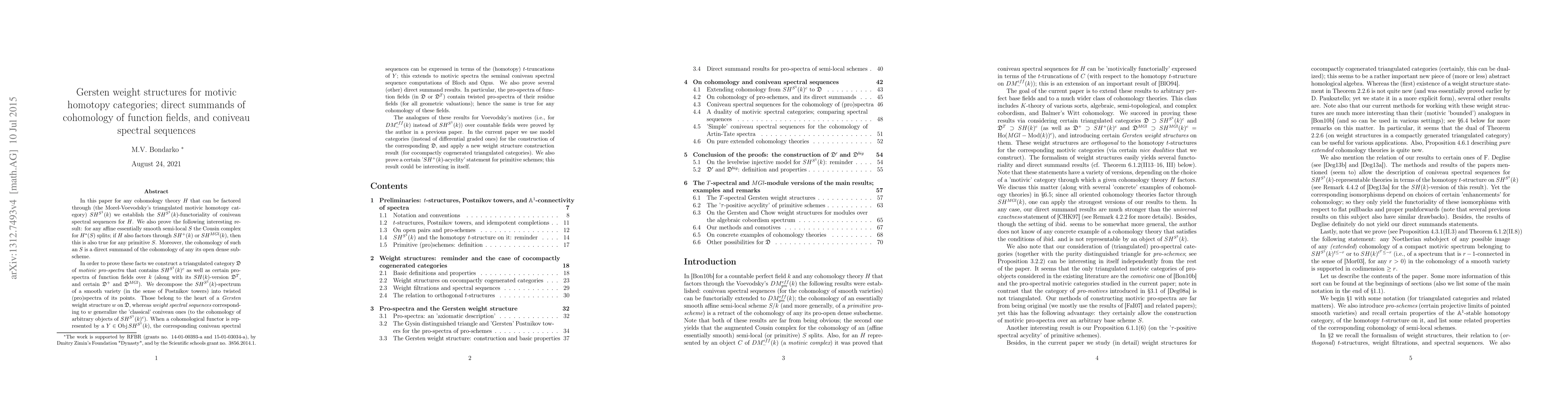 For any cohomology theory $H$ that can be factorized through (the Morel-Voevodsky's triangulated motivic homotopy category) $SH^{S^1}(k)$ (or through $SH(k)$) we establish the $SH^{S^1}(k)$-functorialty (resp. $SH(k)$-one) of coniveau spectral sequences for $H$. We also prove: for any affine essentially smooth semi-local $S$ the Cousin complex for $H^*(S)$ splits; if $H$ also factorizes through $SH^+(k)$ or $SH^{MGL}(k)$, then this is also true for any primitive $S$. Moreover, the cohomology of such an $S$ is a direct summand of the cohomology of any its open dense subscheme. This is a vast generalization of the results of a previous paper. In order to prove these results we consider certain categories of motivic pro-spectra, and introduce Gersten weight structures for them. Our results rely on several interesting statements on weight structures in cocompactly cogenerated triangulated categories and on the '$SH^+(k)$-acyclity' of primitive schemes. .
