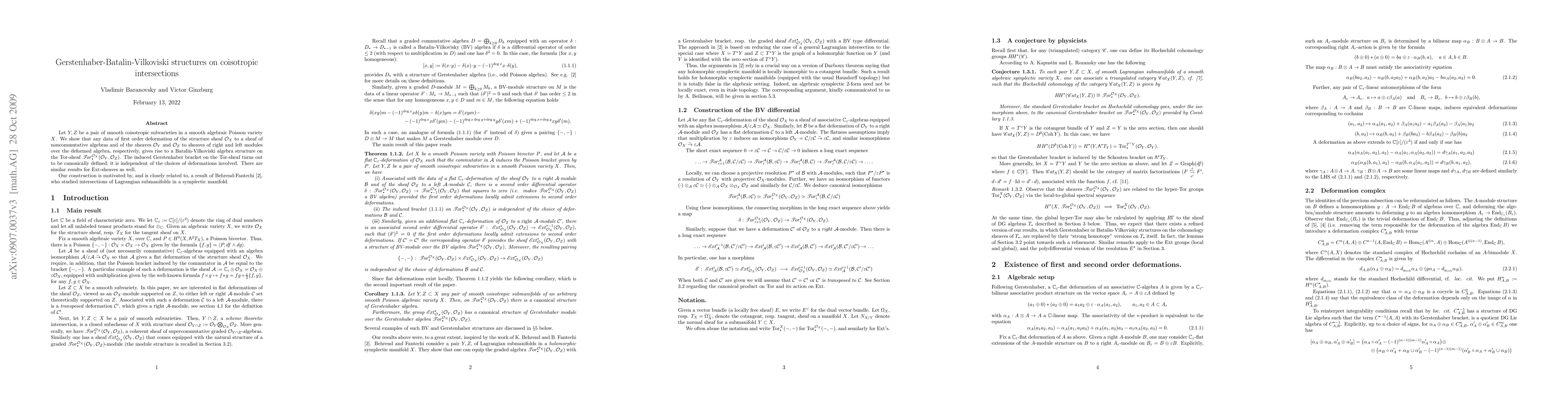 Let Y,Z be a pair of smooth coisotropic subvarieties in a smooth algebraic Poisson variety X. We show that any data of first order deformation of the structure sheaf O_X to a sheaf of noncommutative algebras and of the sheaves O_Y and O_Z to sheaves of right and left modules over the deformed algebra, respectively, gives rise to a Batalin-Vilkoviski algebra structure on the Tor-sheaf Tor^{O_X}_*(O_Y, O_Z). The induced Gerstenhaber bracket on the Tor-sheaf turns out to be canonically defined; it is independent of the choices of deformations involved. There are similar results for Ext-sheaves as well. Our construction is motivated by, and is closely related to, a result of Behrend-Fantechi, who considered the case of Lagrangian submanifolds in a symplectic manifold.