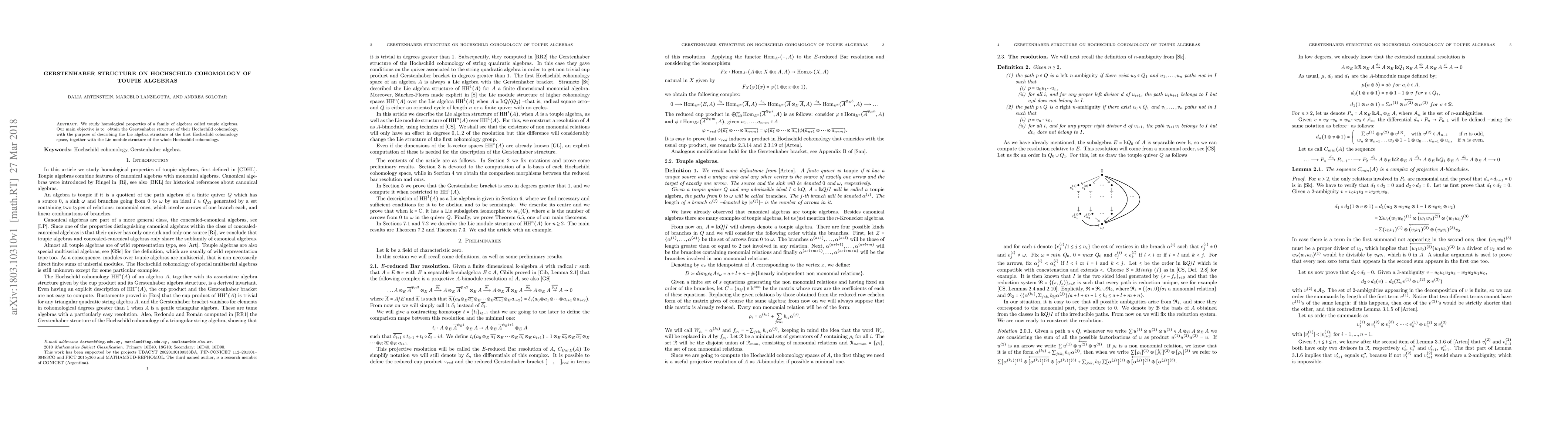 This paper investigates the homological properties of toupie algebras, focusing on establishing a Gerstenhaber structure on their Hochschild cohomology to describe the Lie algebra structure of the first Hochschild cohomology and the Lie module structure of the entire Hochschild cohomology.
