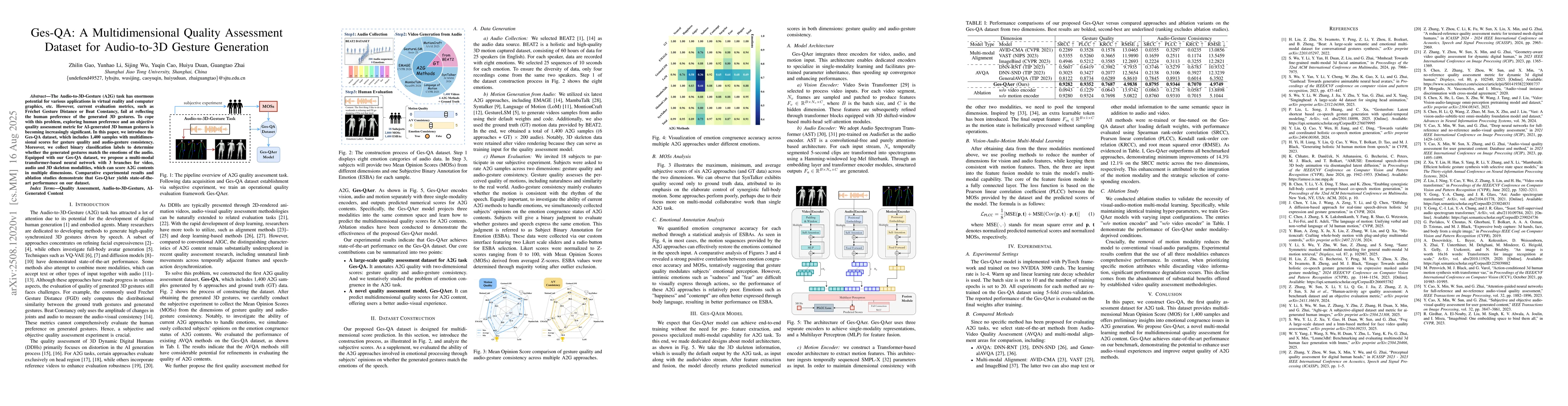 The Audio-to-3D-Gesture (A2G) task has enormous potential for various applications in virtual reality and computer graphics, etc. However, current evaluation metrics, such as Fr\'echet Gesture Distance or Beat Constancy, fail at reflecting the human preference of the generated 3D gestures. To cope with this problem, exploring human preference and an objective quality assessment metric for AI-generated 3D human gestures is becoming increasingly significant. In this paper, we introduce the Ges-QA dataset, which includes 1,400 samples with multidimensional scores for gesture quality and audio-gesture consistency. Moreover, we collect binary classification labels to determine whether the generated gestures match the emotions of the audio. Equipped with our Ges-QA dataset, we propose a multi-modal transformer-based neural network with 3 branches for video, audio and 3D skeleton modalities, which can score A2G contents in multiple dimensions. Comparative experimental results and ablation studies demonstrate that Ges-QAer yields state-of-the-art performance on our dataset.