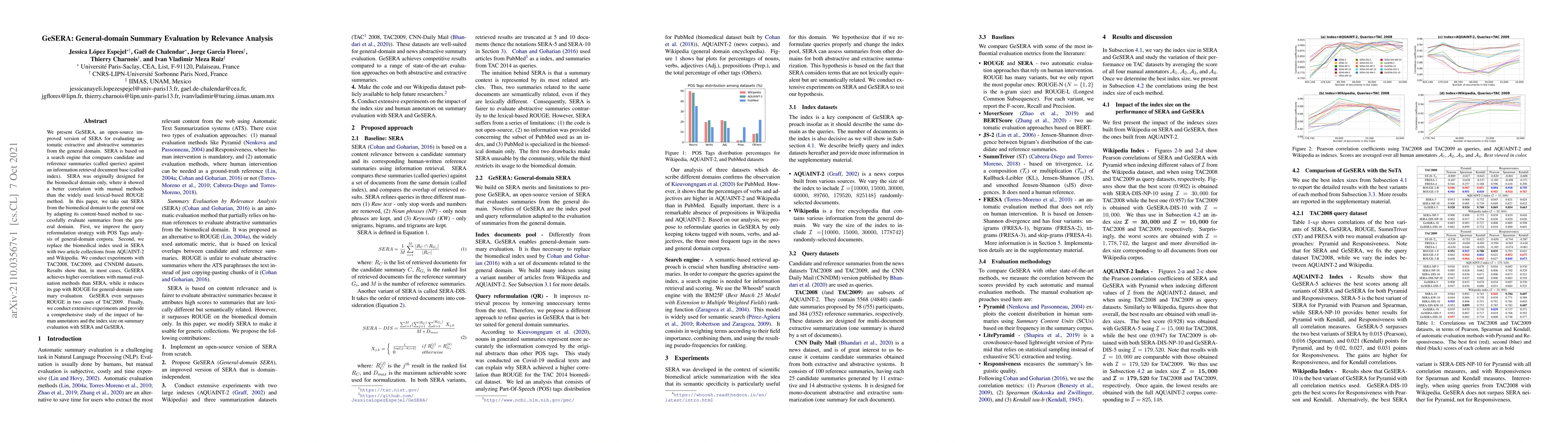 We present GeSERA, an open-source improved version of SERA for evaluating automatic extractive and abstractive summaries from the general domain. SERA is based on a search engine that compares candidate and reference summaries (called queries) against an information retrieval document base (called index). SERA was originally designed for the biomedical domain only, where it showed a better correlation with manual methods than the widely used lexical-based ROUGE method. In this paper, we take out SERA from the biomedical domain to the general one by adapting its content-based method to successfully evaluate summaries from the general domain. First, we improve the query reformulation strategy with POS Tags analysis of general-domain corpora. Second, we replace the biomedical index used in SERA with two article collections from AQUAINT-2 and Wikipedia. We conduct experiments with TAC2008, TAC2009, and CNNDM datasets. Results show that, in most cases, GeSERA achieves higher correlations with manual evaluation methods than SERA, while it reduces its gap with ROUGE for general-domain summary evaluation. GeSERA even surpasses ROUGE in two cases of TAC2009. Finally, we conduct extensive experiments and provide a comprehensive study of the impact of human annotators and the index size on summary evaluation with SERA and GeSERA.