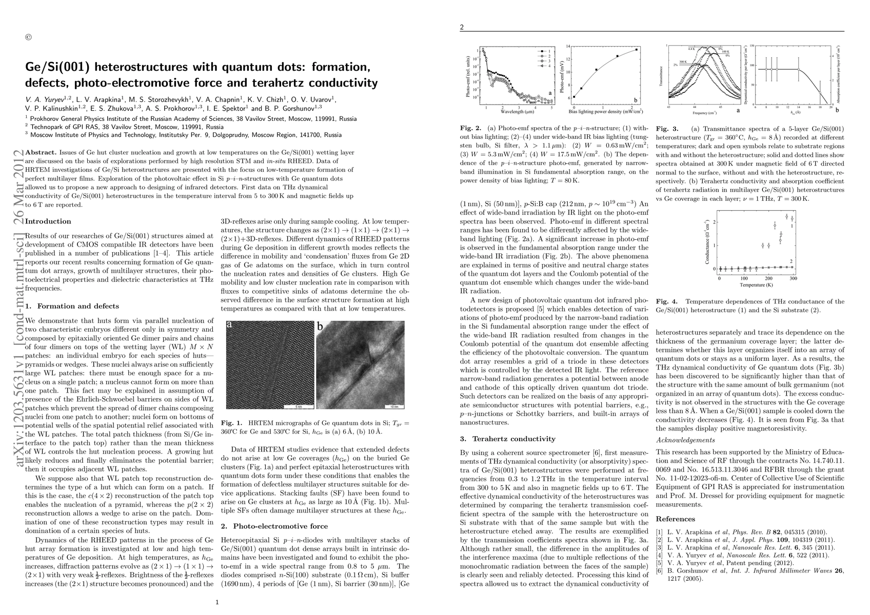 Issues of Ge hut cluster nucleation and growth at low temperatures on the Ge/Si(001) wetting layer are discussed on the basis of explorations performed by high resolution STM and in-situ RHEED. Data of HRTEM investigations of Ge/Si heterostructures are presented with the focus on low-temperature formation of perfect multilayer films. Exploration of the photovoltaic effect in Si p--i--n-structures with Ge quantum dots allowed us to propose a new approach to designing of infrared detectors. First data on THz dynamical conductivity of Ge/Si(001) heterostructures in the temperature interval from 5 to 300 K and magnetic fields up to 6 T are reported.