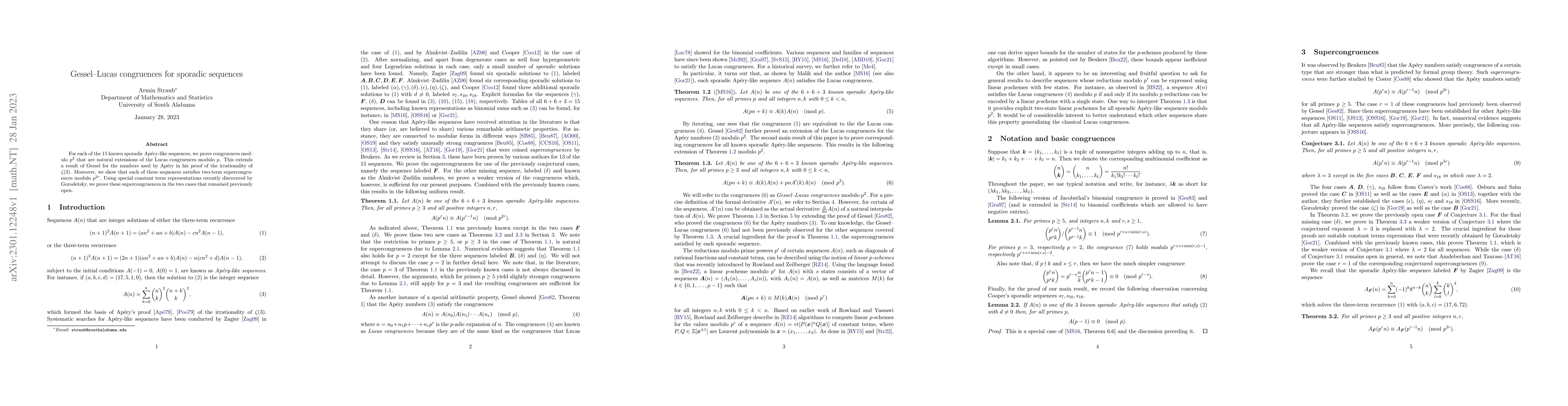 The paper establishes congruences modulo $p^2$ for 15 sporadic Apéry-like sequences, extending Gessel's Lucas congruences, and demonstrates two-term supercongruences modulo $p^{2r}$ using Gorodetsky's constant term representations.