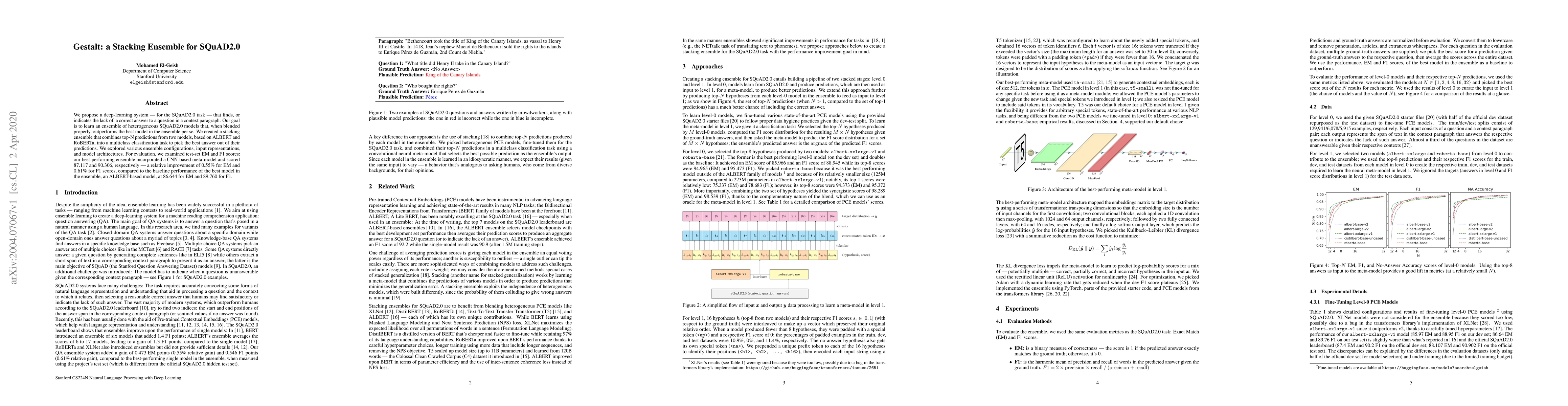 We propose a deep-learning system -- for the SQuAD2.0 task -- that finds, or indicates the lack of, a correct answer to a question in a context paragraph. Our goal is to learn an ensemble of heterogeneous SQuAD2.0 models that, when blended properly, outperforms the best model in the ensemble per se. We created a stacking ensemble that combines top-N predictions from two models, based on ALBERT and RoBERTa, into a multiclass classification task to pick the best answer out of their predictions. We explored various ensemble configurations, input representations, and model architectures. For evaluation, we examined test-set EM and F1 scores; our best-performing ensemble incorporated a CNN-based meta-model and scored 87.117 and 90.306, respectively -- a relative improvement of 0.55% for EM and 0.61% for F1 scores, compared to the baseline performance of the best model in the ensemble, an ALBERT-based model, at 86.644 for EM and 89.760 for F1.