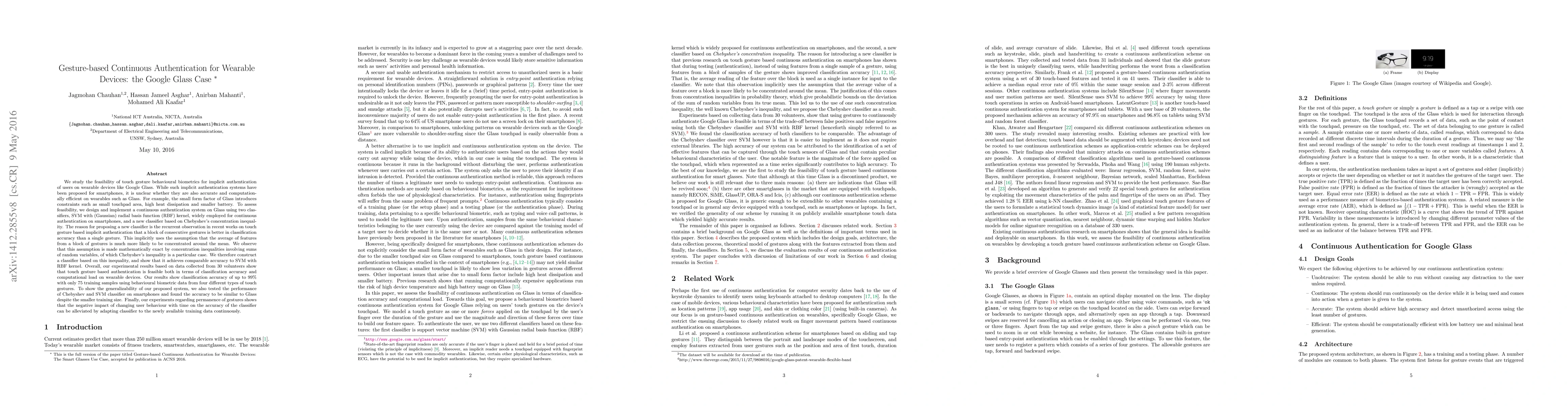 This paper proposes a continuous authentication system for Google Glass using touch gesture behavioural biometrics, achieving up to 99% accuracy with 75 training samples. The system demonstrates feasibility in both accuracy and computational efficiency, and its performance is comparable across smartglasses and smartphones.
