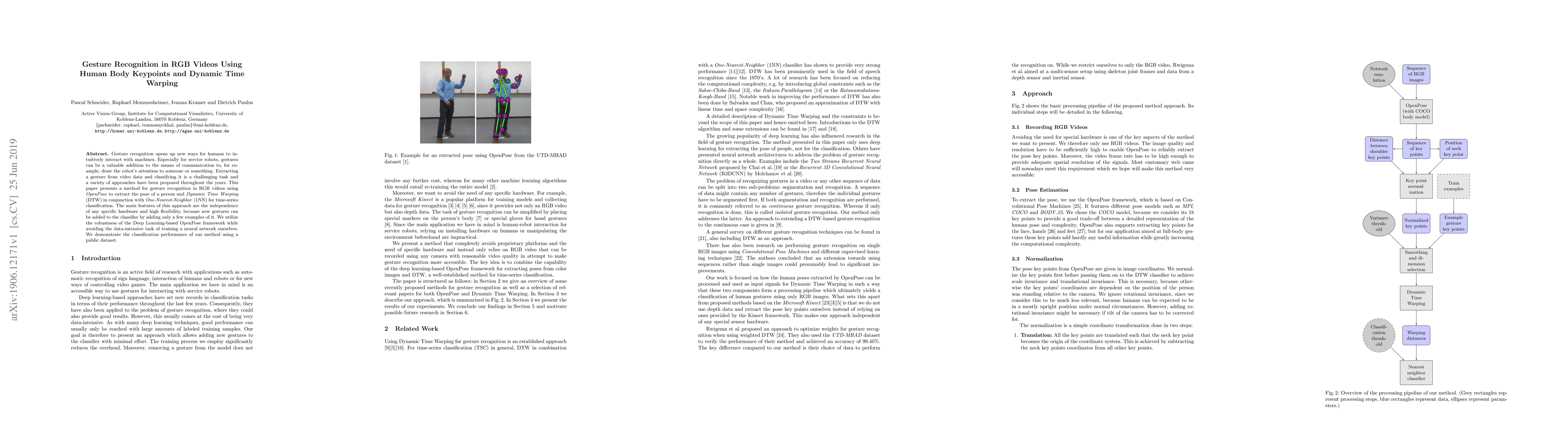 Gesture recognition opens up new ways for humans to intuitively interact with machines. Especially for service robots, gestures can be a valuable addition to the means of communication to, for example, draw the robot's attention to someone or something. Extracting a gesture from video data and classifying it is a challenging task and a variety of approaches have been proposed throughout the years. This paper presents a method for gesture recognition in RGB videos using OpenPose to extract the pose of a person and Dynamic Time Warping (DTW) in conjunction with One-Nearest-Neighbor (1NN) for time-series classification. The main features of this approach are the independence of any specific hardware and high flexibility, because new gestures can be added to the classifier by adding only a few examples of it. We utilize the robustness of the Deep Learning-based OpenPose framework while avoiding the data-intensive task of training a neural network ourselves. We demonstrate the classification performance of our method using a public dataset.