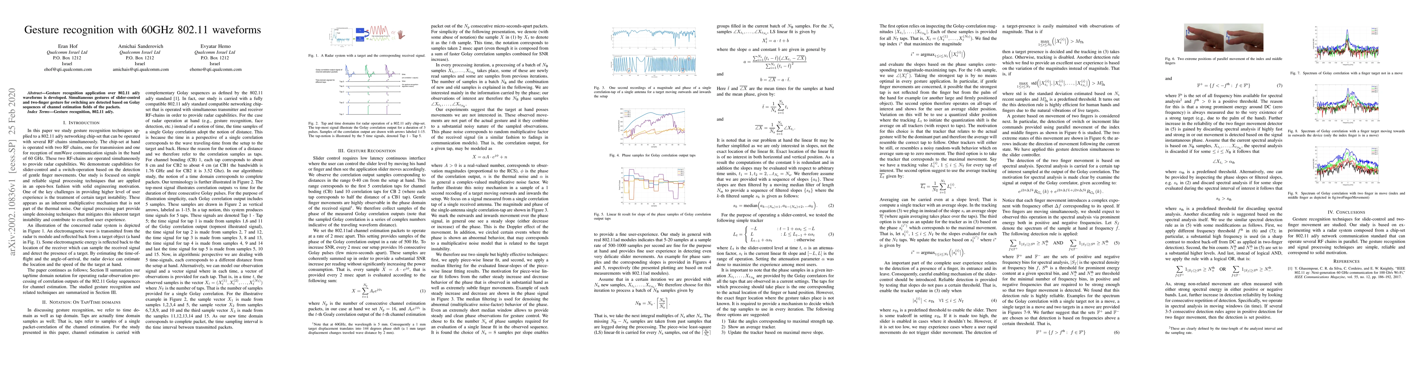 Gesture recognition application over 802.11 ad/y waveforms is developed. Simultaneous gestures of slider-control and two-finger gesture for switching are detected based on Golay sequences of channel estimation fields of the packets.