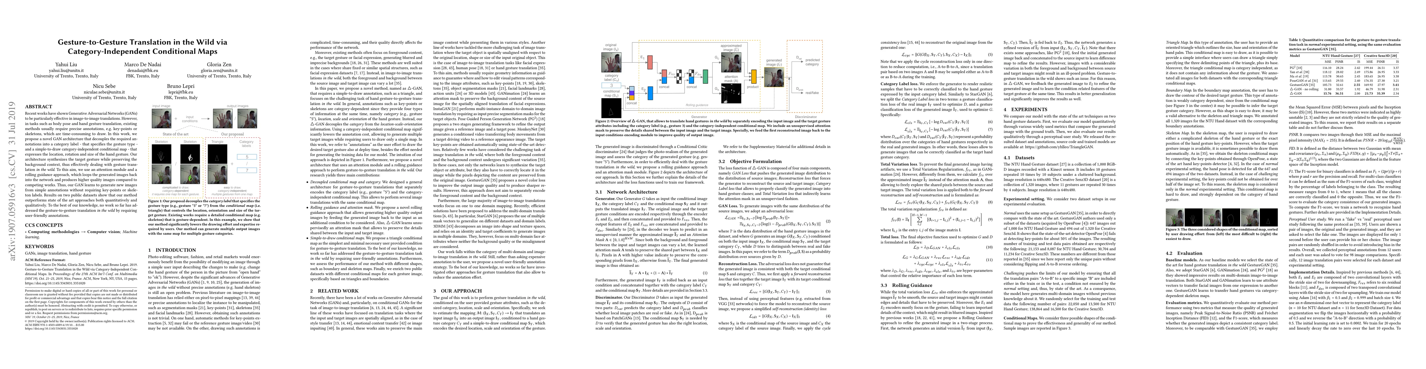 Recent works have shown Generative Adversarial Networks (GANs) to be particularly effective in image-to-image translations. However, in tasks such as body pose and hand gesture translation, existing methods usually require precise annotations, e.g. key-points or skeletons, which are time-consuming to draw. In this work, we propose a novel GAN architecture that decouples the required annotations into a category label - that specifies the gesture type - and a simple-to-draw category-independent conditional map - that expresses the location, rotation and size of the hand gesture. Our architecture synthesizes the target gesture while preserving the background context, thus effectively dealing with gesture translation in the wild. To this aim, we use an attention module and a rolling guidance approach, which loops the generated images back into the network and produces higher quality images compared to competing works. Thus, our GAN learns to generate new images from simple annotations without requiring key-points or skeleton labels. Results on two public datasets show that our method outperforms state of the art approaches both quantitatively and qualitatively. To the best of our knowledge, no work so far has addressed the gesture-to-gesture translation in the wild by requiring user-friendly annotations.