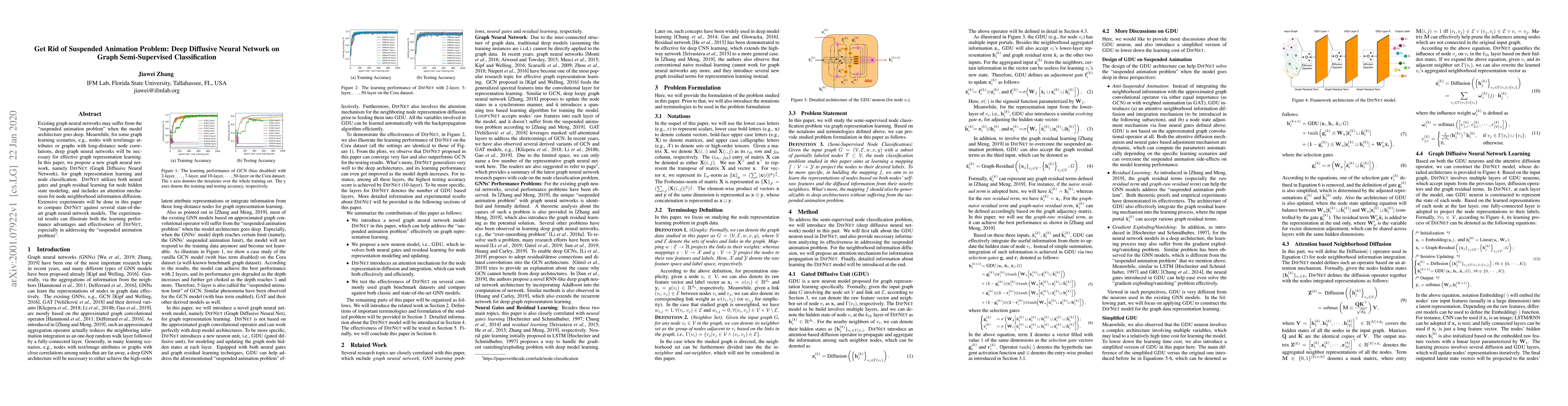 A new graph neural network model called DIFNET addresses the suspended animation problem in deep graph neural networks, achieving better performance and learning advantages for node classification tasks.