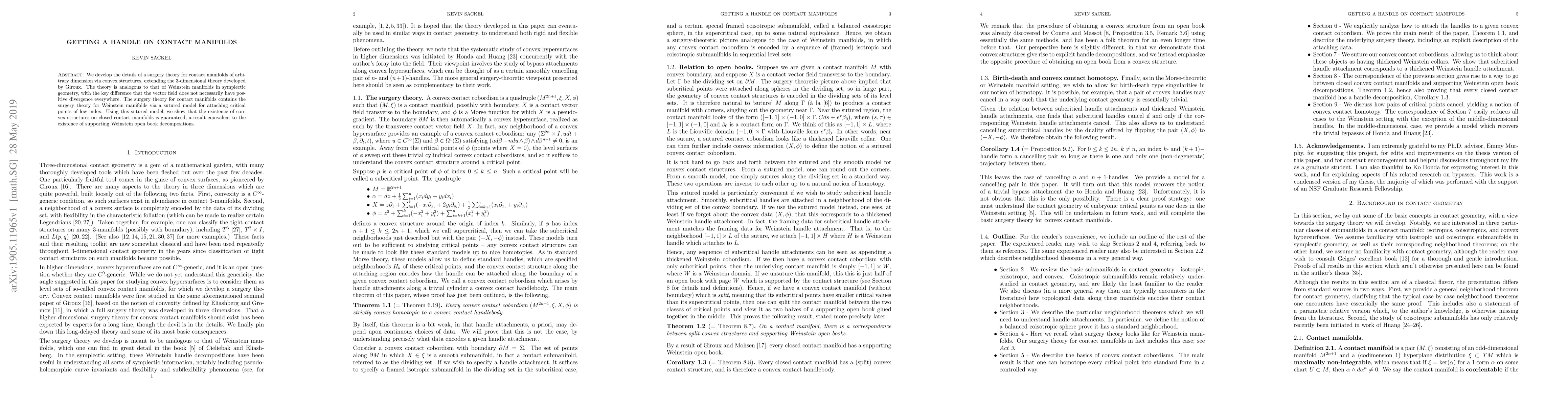 We develop the details of a surgery theory for contact manifolds of arbitrary dimension via convex structures, extending the 3-dimensional theory developed by Giroux. The theory is analogous to that of Weinstein manifolds in symplectic geometry, with the key difference that the vector field does not necessarily have positive divergence everywhere. The surgery theory for contact manifolds contains the surgery theory for Weinstein manifolds via a sutured model for attaching critical points of low index. Using this sutured model, we show that the existence of convex structures on closed contact manifolds is guaranteed, a result equivalent to the existence of supporting Weinstein open book decompositions.