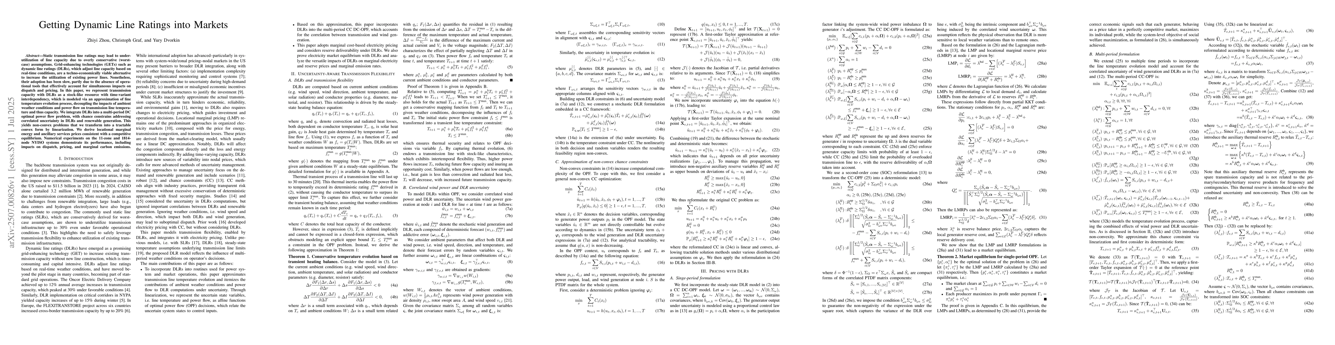 Static transmission line ratings may lead to underutilization of line capacity due to overly conservative (worst-case) assumptions. Grid-enhancing technologies (GETs) such as dynamic line ratings (DLRs), which adjust line capacity based on real-time conditions, are a techno-economically viable alternative to increase the utilization of existing power lines. Nonetheless, their adoption has been slow, partly due to the absence of operational tools that effectively account for simultaneous impacts on dispatch and pricing. In this paper, we represent transmission capacity with DLRs as a stock-like resource with time-variant interdependency, which is modeled via an approximation of line temperature evolution process, decoupling the impacts of ambient weather conditions and power flow on transmission line temperature and thus capacity. We integrate DLRs into a multi-period DC optimal power flow problem, with chance constrains addressing correlated uncertainty in DLRs and renewable generation. This yields non-convex problems that we transform into a tractable convex form by linearization. We derive locational marginal energy and ancillary services prices consistent with a competitive equilibrium. Numerical experiments on the 11-zone and 1814-node NYISO systems demonstrate its performance, including impacts on dispatch, pricing, and marginal carbon emissions.