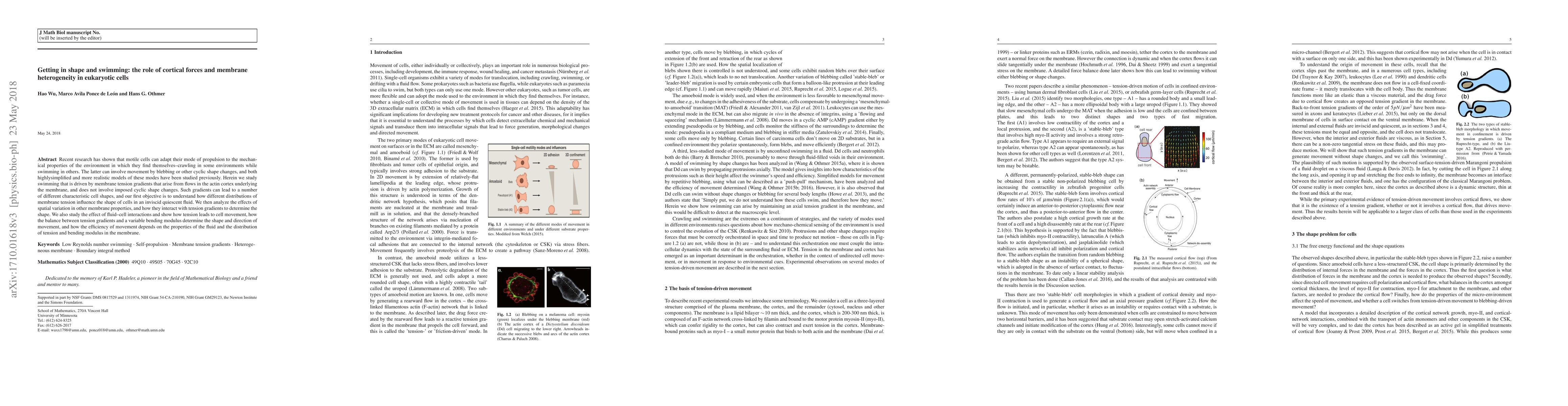 Recent research has shown that motile cells can adapt their mode of propulsion to the mechanical properties of the environment in which they find themselves--crawling in some environments while swimming in others. The latter can involve movement by blebbing or other cyclic shape changes, and both highlysimplified and more realistic models of these modes have been studied previously. Herein we study swimming that is driven by membrane tension gradients that arise from flows in the actin cortex underlying the membrane, and does not involve imposed cyclic shape changes. Such gradients can lead to a number of different characteristic cell shapes, and our first objective is to understand how different distributions of membrane tension influence the shape of cells in an inviscid quiescent fluid. We then analyze the effects of spatial variation in other membrane properties, and how they interact with tension gradients to determine the shape. We also study the effect of fluid--cell interactions and show how tension leads to cell movement, how the balance between tension gradients and a variable bending modulus determine the shape and direction of movement, and how the efficiency of movement depends on the properties of the fluid and the distribution of tension and bending modulus in the membrane.