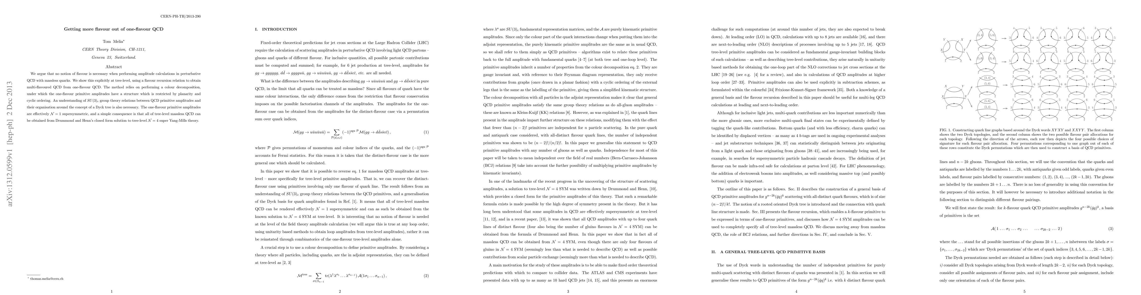 We argue that no notion of flavour is necessary when performing amplitude calculations in perturbative QCD with massless quarks. We show this explicitly at tree-level, using a flavour recursion relation to obtain multi-flavoured QCD from one-flavour QCD. The method relies on performing a colour decomposition, under which the one-flavour primitive amplitudes have a structure which is restricted by planarity and cyclic ordering. An understanding of SU(3)_c group theory relations between QCD primitive amplitudes and their organisation around the concept of a Dyck tree is also necessary. The one-flavour primitive amplitudes are effectively N=1 supersymmetric, and a simple consequence is that all of tree-level massless QCD can be obtained from Drummond and Henn's closed form solution to tree-level N=4 super Yang-Mills theory.
