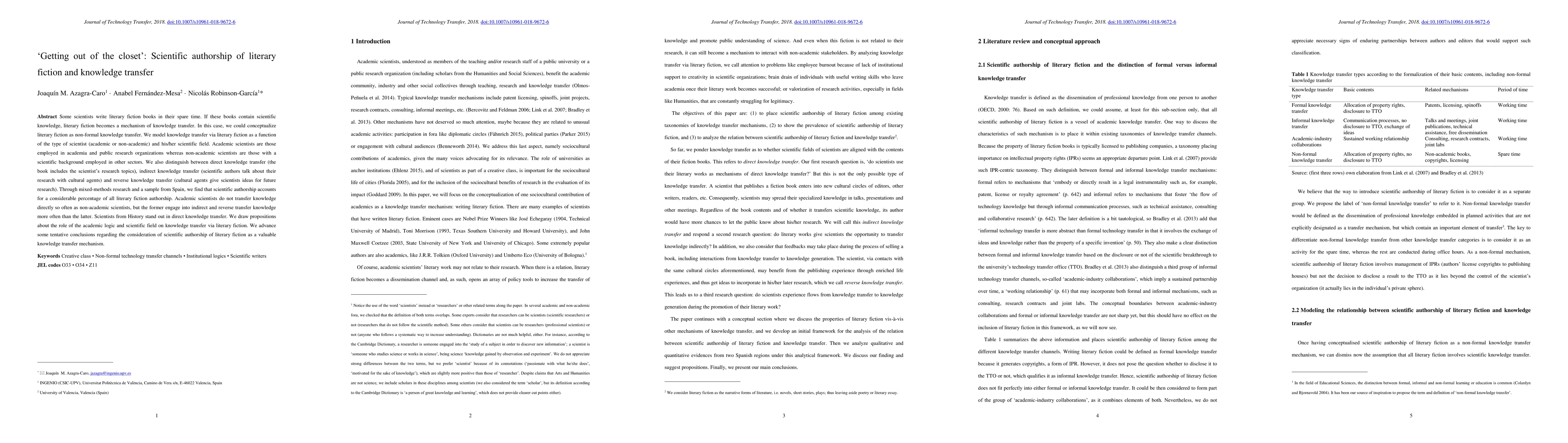 Some scientists write literary fiction books in their spare time. If these books contain scientific knowledge, literary fiction becomes a mechanism of knowledge transfer. In this case, we could conceptualize literary fiction as non-formal knowledge transfer. We model knowledge transfer via literary fiction as a function of the type of scientist (academic or non-academic) and his/her scientific field. Academic scientists are those employed in academia and public research organizations whereas non-academic scientists are those with a scientific background employed in other sectors. We also distinguish between direct knowledge transfer (the book includes the scientist's research topics), indirect knowledge transfer (scientific authors talk about their research with cultural agents) and reverse knowledge transfer (cultural agents give scientists ideas for future research). Through mixed-methods research and a sample from Spain, we find that scientific authorship accounts for a considerable percentage of all literary fiction authorship. Academic scientists do not transfer knowledge directly so often as non-academic scientists, but the former engage into indirect and reverse transfer knowledge more often than the latter. Scientists from History stand out in direct knowledge transfer. We draw propositions about the role of the academic logic and scientific field on knowledge transfer via literary fiction. We advance some tentative conclusions regarding the consideration of scientific authorship of literary fiction as a valuable knowledge transfer mechanism.