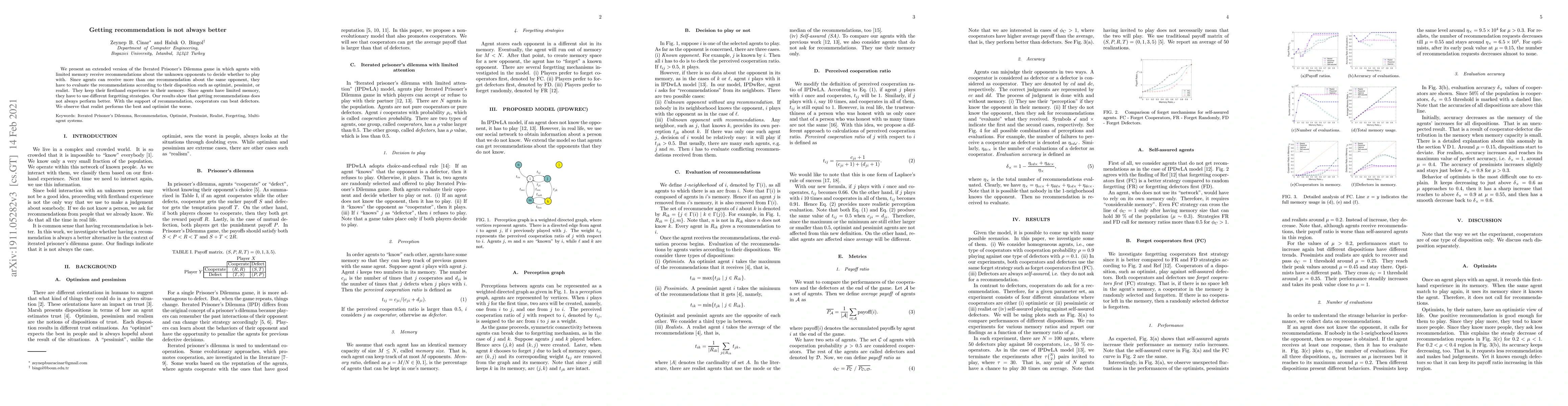 We present an extended version of the Iterated Prisoner's Dilemma game in which agents with limited memory receive recommendations about the unknown opponent to decide whether to play with. Since agents can receive more than one recommendations about the same opponent, they have to evaluate the recommendations according to their disposition such as optimist, pessimist, or realist. They keep their firsthand experience in their memory. Since agents have limited memory, they have to use different forgetting strategies. Our results show that getting recommendations not always perform better. We observe that realist performs the best and optimist the worse.