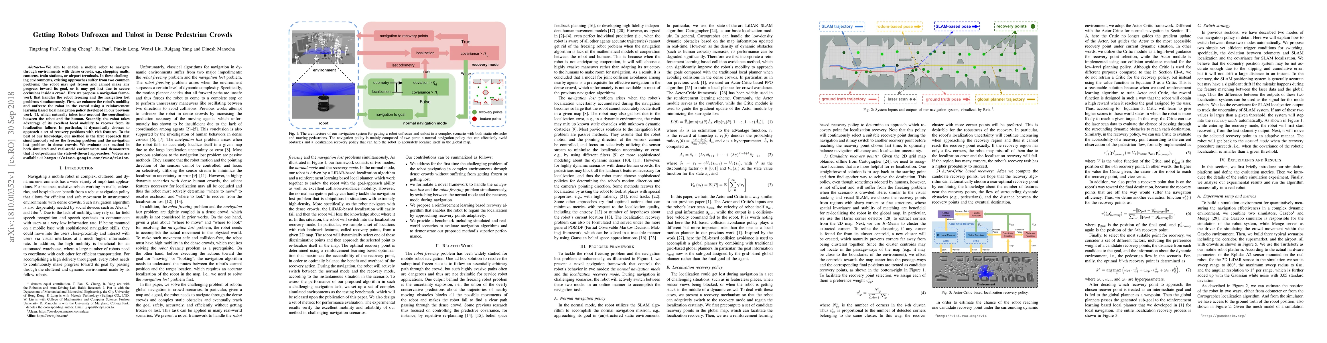 We aim to enable a mobile robot to navigate through environments with dense crowds, e.g., shopping malls, canteens, train stations, or airport terminals. In these challenging environments, existing approaches suffer from two common problems: the robot may get frozen and cannot make any progress toward its goal, or it may get lost due to severe occlusions inside a crowd. Here we propose a navigation framework that handles the robot freezing and the navigation lost problems simultaneously. First, we enhance the robot's mobility and unfreeze the robot in the crowd using a reinforcement learning based local navigation policy developed in our previous work~\cite{long2017towards}, which naturally takes into account the coordination between the robot and the human. Secondly, the robot takes advantage of its excellent local mobility to recover from its localization failure. In particular, it dynamically chooses to approach a set of recovery positions with rich features. To the best of our knowledge, our method is the first approach that simultaneously solves the freezing problem and the navigation lost problem in dense crowds. We evaluate our method in both simulated and real-world environments and demonstrate that it outperforms the state-of-the-art approaches. Videos are available at https://sites.google.com/view/rlslam.