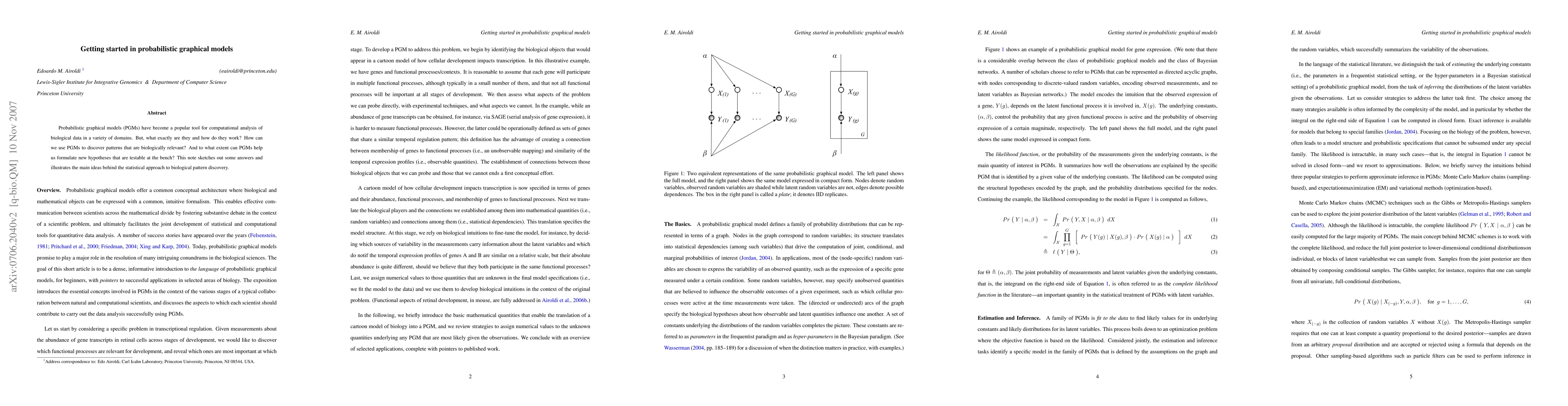 Probabilistic graphical models (PGMs) have become a popular tool for computational analysis of biological data in a variety of domains. But, what exactly are they and how do they work? How can we use PGMs to discover patterns that are biologically relevant? And to what extent can PGMs help us formulate new hypotheses that are testable at the bench? This note sketches out some answers and illustrates the main ideas behind the statistical approach to biological pattern discovery.
