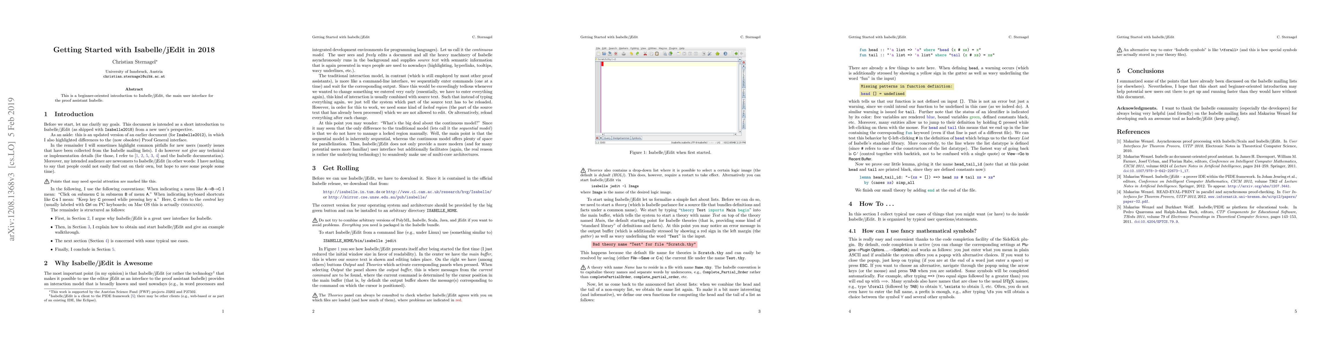 Summary: This paper provides a beginner-friendly introduction to Isabelle/jEdit, the primary interface for the Isabelle proof assistant, aimed at helping newcomers get started with formal proof development. It covers basic setup and fundamental usage.
