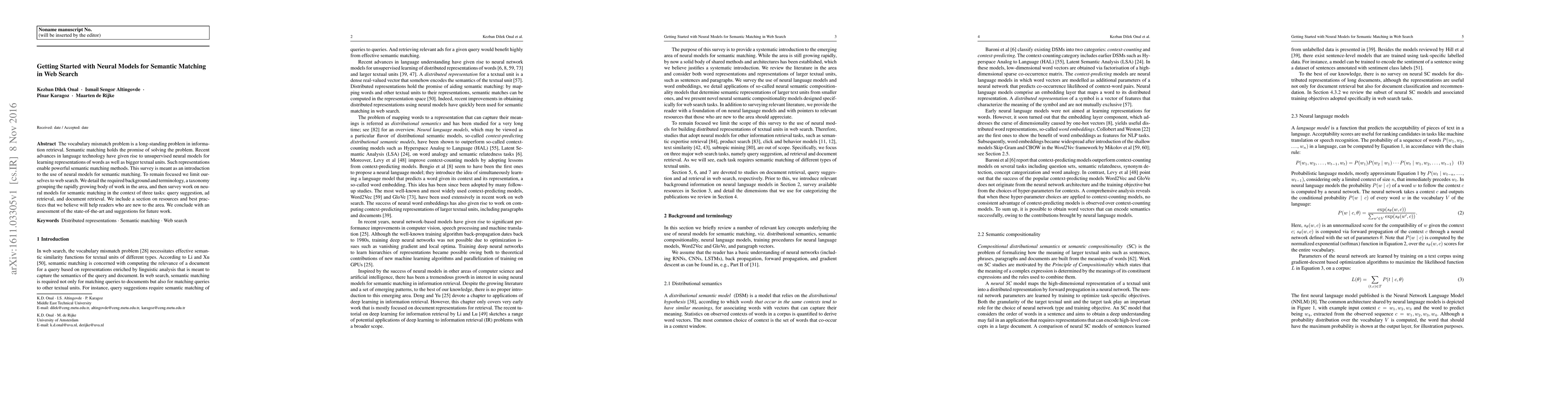 The vocabulary mismatch problem is a long-standing problem in information retrieval. Semantic matching holds the promise of solving the problem. Recent advances in language technology have given rise to unsupervised neural models for learning representations of words as well as bigger textual units. Such representations enable powerful semantic matching methods. This survey is meant as an introduction to the use of neural models for semantic matching. To remain focused we limit ourselves to web search. We detail the required background and terminology, a taxonomy grouping the rapidly growing body of work in the area, and then survey work on neural models for semantic matching in the context of three tasks: query suggestion, ad retrieval, and document retrieval. We include a section on resources and best practices that we believe will help readers who are new to the area. We conclude with an assessment of the state-of-the-art and suggestions for future work.