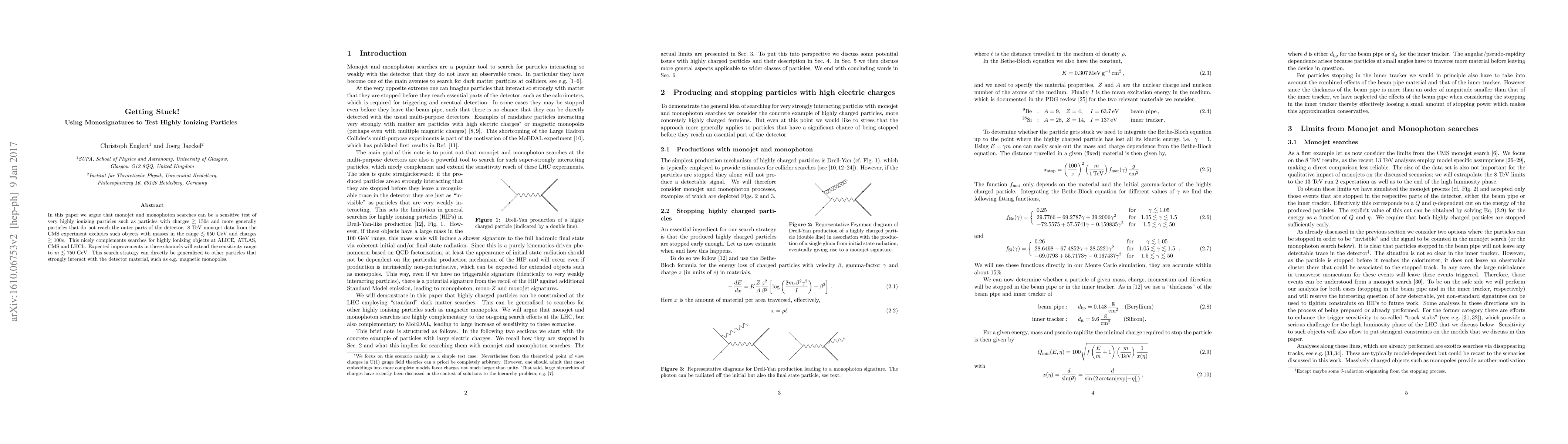 In this paper we argue that monojet and monophoton searches can be a sensitive test of very highly ionizing particles such as particles with charges $\gtrsim 150e$ and more generally particles that do not reach the outer parts of the detector. 8 TeV monojet data from the CMS experiment excludes such objects with masses in the range $\lesssim 650~{\text{GeV}}$ and charges $\gtrsim 100e$. This nicely complements searches for highly ionizing objects at ALICE, ATLAS, CMS and LHCb. Expected improvements in these channels will extend the sensitivity range to $m\lesssim 750~{\text{GeV}}$. This search strategy can directly be generalized to other particles that strongly interact with the detector material, such as e.g. magnetic monopoles.