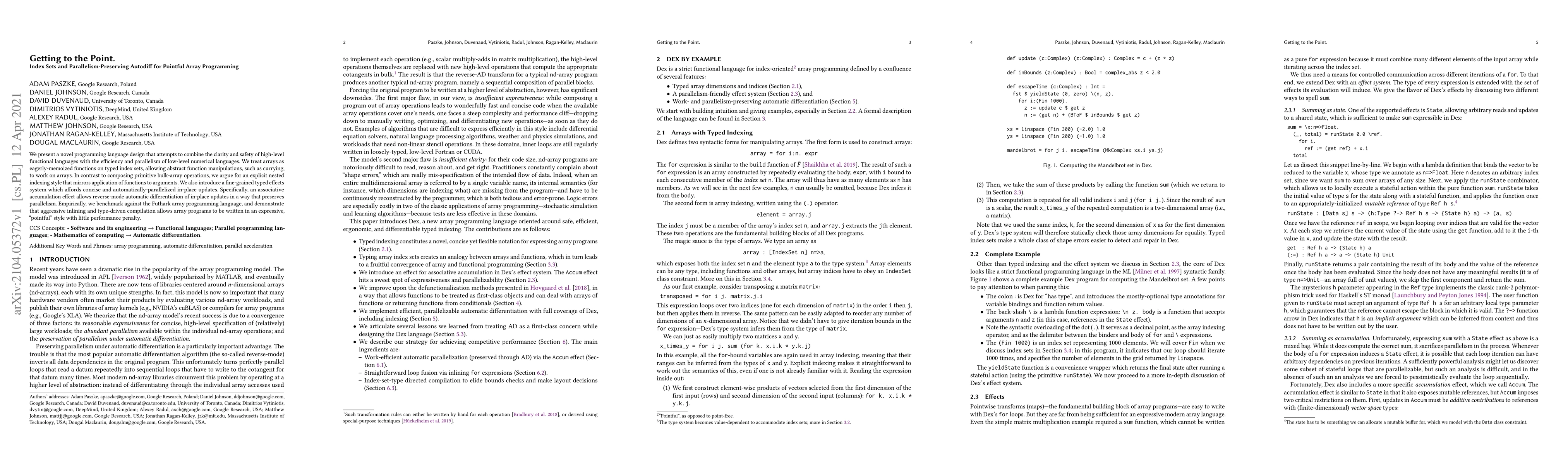 We present a novel programming language design that attempts to combine the clarity and safety of high-level functional languages with the efficiency and parallelism of low-level numerical languages. We treat arrays as eagerly-memoized functions on typed index sets, allowing abstract function manipulations, such as currying, to work on arrays. In contrast to composing primitive bulk-array operations, we argue for an explicit nested indexing style that mirrors application of functions to arguments. We also introduce a fine-grained typed effects system which affords concise and automatically-parallelized in-place updates. Specifically, an associative accumulation effect allows reverse-mode automatic differentiation of in-place updates in a way that preserves parallelism. Empirically, we benchmark against the Futhark array programming language, and demonstrate that aggressive inlining and type-driven compilation allows array programs to be written in an expressive, "pointful" style with little performance penalty.