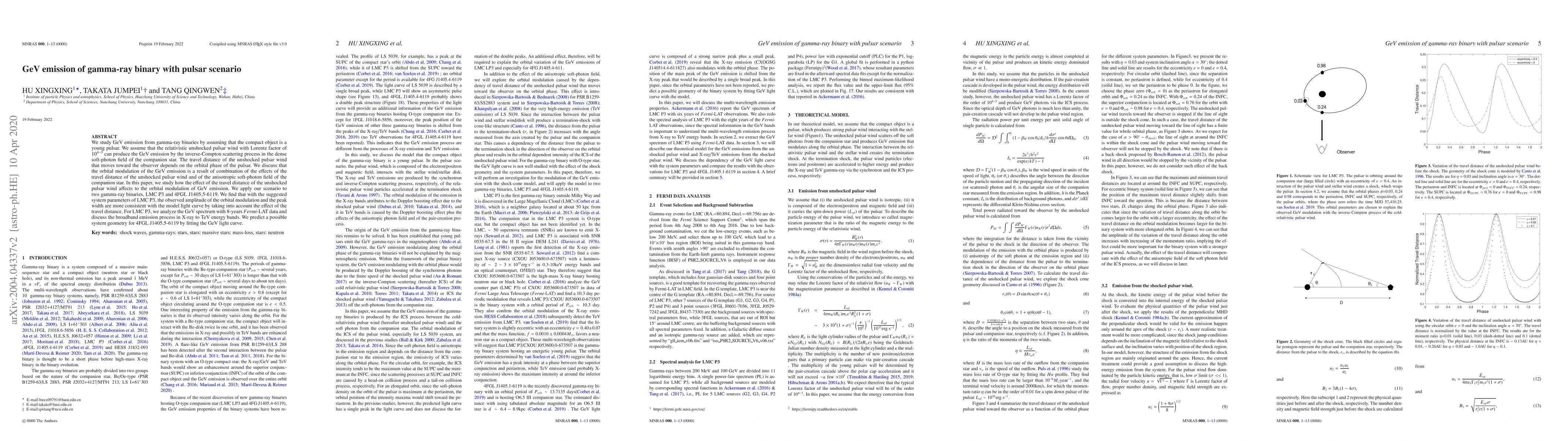 We study GeV emission from gamma-ray binaries by assuming that the compact object is a young pulsar. We assume that the relativistic unshocked pulsar wind with Lorentz factor of 10^4~5 can produce the GeV emission by the inverse-Compton scattering process in the dense soft-photon field of the companion star. The travel distance of the unshocked pulsar wind that moves toward the observer depends on the orbital phase of the pulsar. We discuss that the orbital modulation of the GeV emission is a result of combination of the effects of the travel distance of the unshocked pulsar wind and of the anisotropic soft-photon field of the companion star. In this paper, we study how the effect of the travel distance of the unshocked pulsar wind affects to the orbital modulation of GeV emission. We apply our scenario to two gamma-ray binaries, LMC P3 and 4FGL J1405.5-6119. We find that with the suggested system parameters of LMC P3, the observed amplitude of the orbital modulation and the peak width are more consistent with the model light curve by taking into account the effect of the travel distance. For LMC P3, we analyze the GeV spectrum with 8-years Fermi-LAT data and discuss the broadband emission process in X-ray to TeV energy bands. We predict a possible system geometry for 4FGL J1405.5-6119 by fitting the GeV light curve. Key words: shock waves, gamma-rays: stars, stars: massive stars: mass-loss, stars: neutron