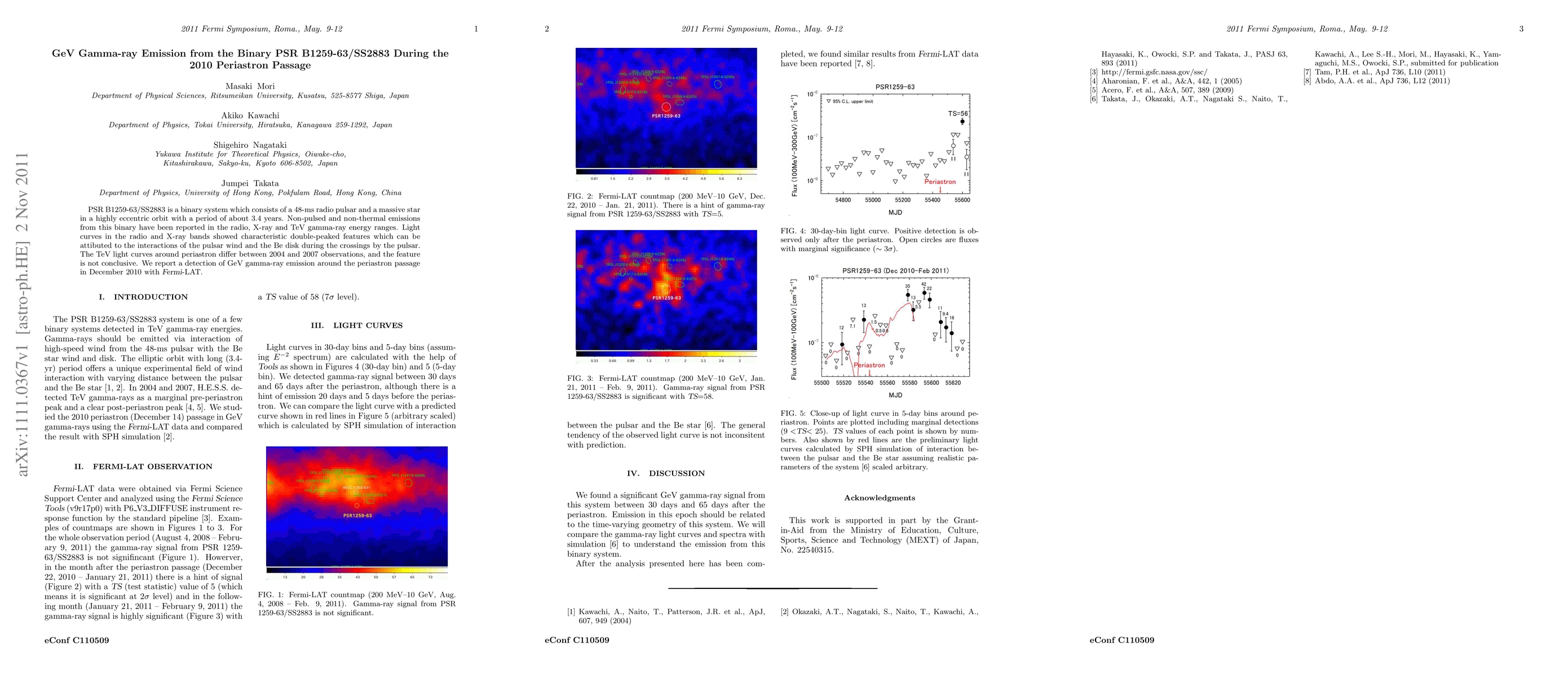 The Fermi-LAT detected GeV gamma-ray emission from the binary PSR B1259-63/SS2883 during its 2010 periastron passage, marking a significant observation of high-energy emission in this system. This finding expands our understanding of the complex interactions between the pulsar wind and the Be disk.