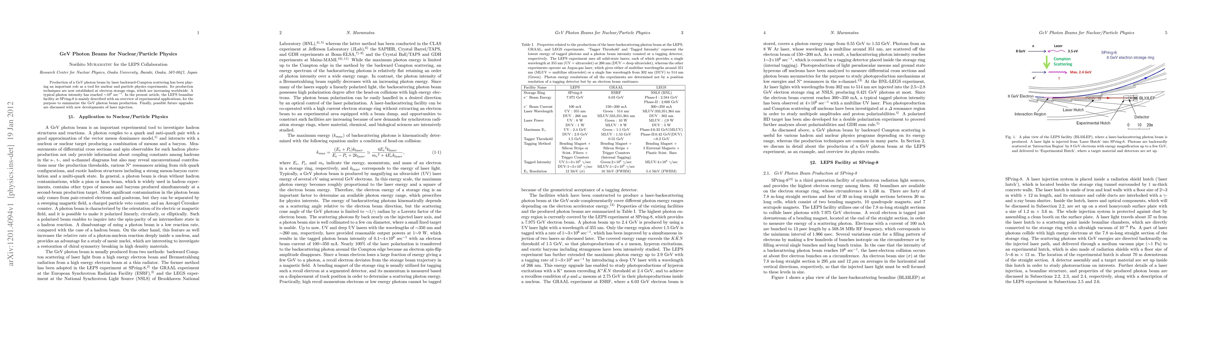 Scientists have established a method for producing GeV photon beams through laser backward-Compton scattering, enabling nuclear and particle physics experiments. The LEPS beamline facility at SPring-8 showcases the production techniques and discusses future upgrades with new developments in laser injection.