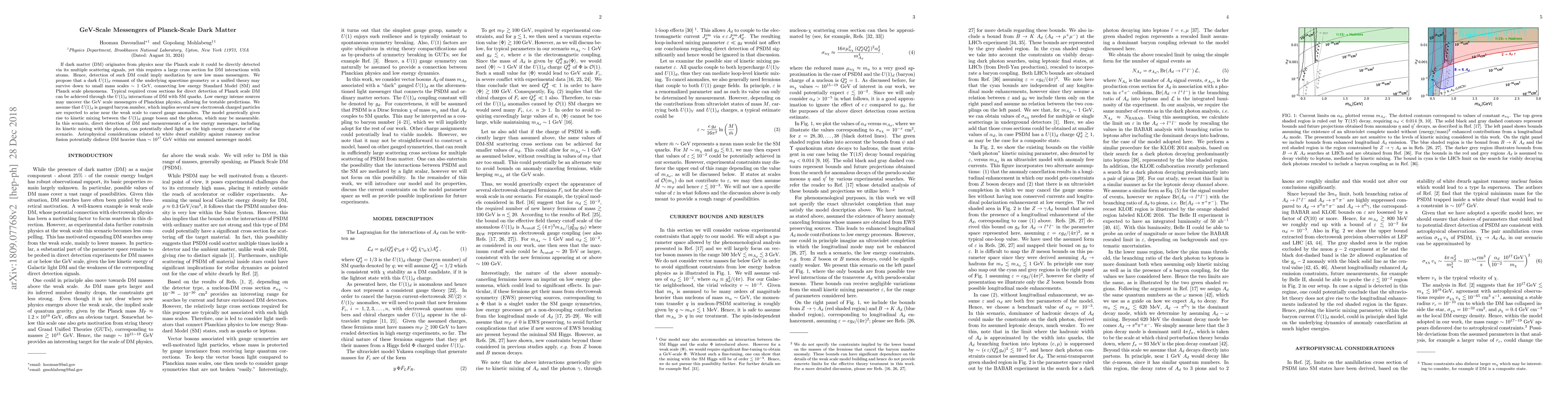 This paper proposes that GeV-scale messengers, possibly mediated by a dark $U(1)_d$ gauge symmetry, could connect Planck-scale dark matter to the Standard Model, enabling its detection through large interaction cross sections and kinetic mixing with the photon. The model predicts new electroweak particles and suggests that low-energy sources may reveal these messengers, offering testable predictions.