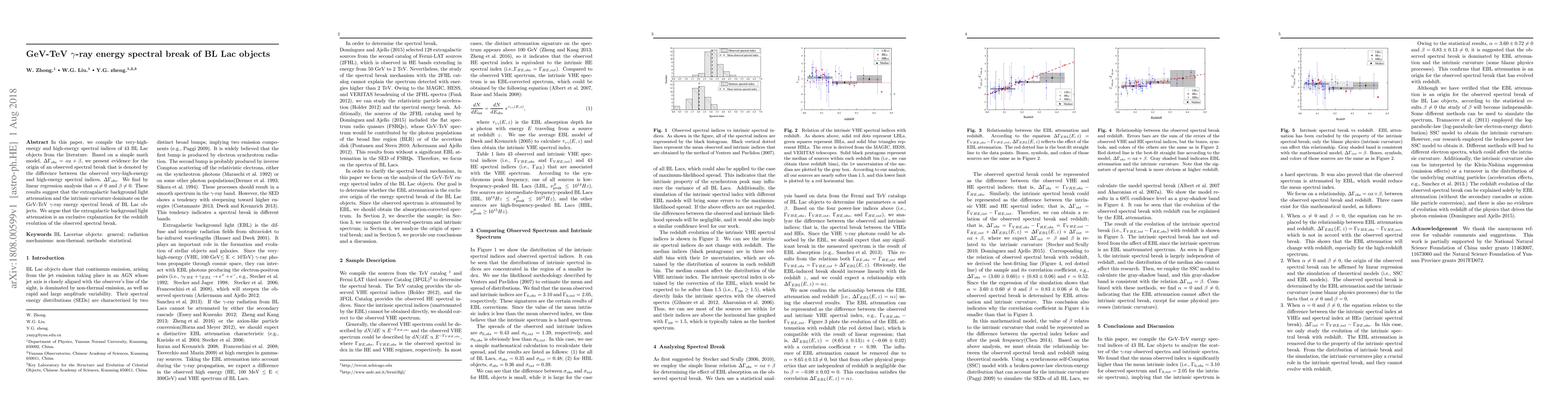 This paper compiles spectral indices of 43 BL Lac objects and uses a model to demonstrate that the GeV-TeV $\gamma$-ray spectral break is primarily due to extragalactic background light attenuation and intrinsic curvature, with no zero slope values found in the regression analysis.