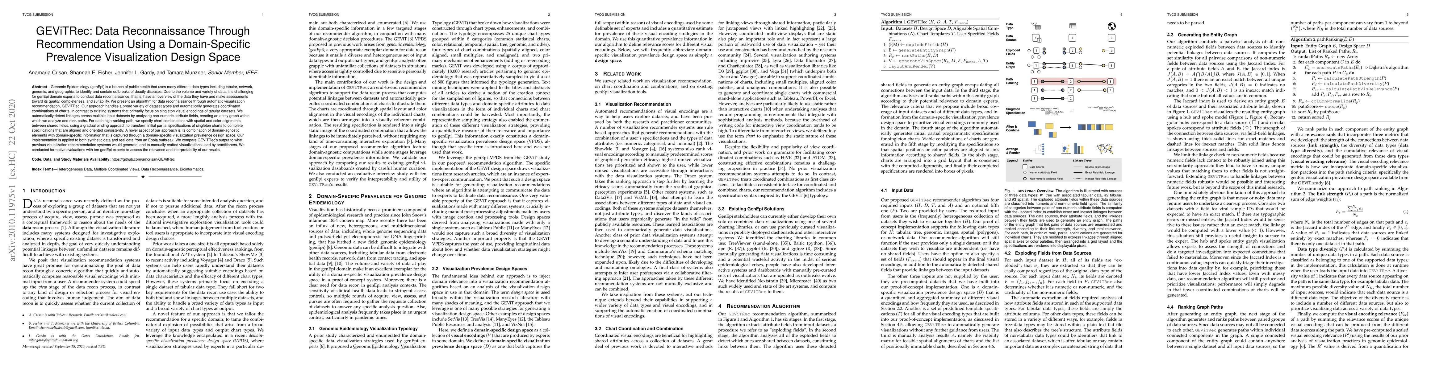 GEViTRec is an algorithm for automatic visualization recommendation to aid genomic epidemiology experts in data reconnaissance. It generates coordinated chart combinations across various dataset types, leveraging domain-specific prevalence visualizations and expert evaluations to enhance relevance and interpretability.