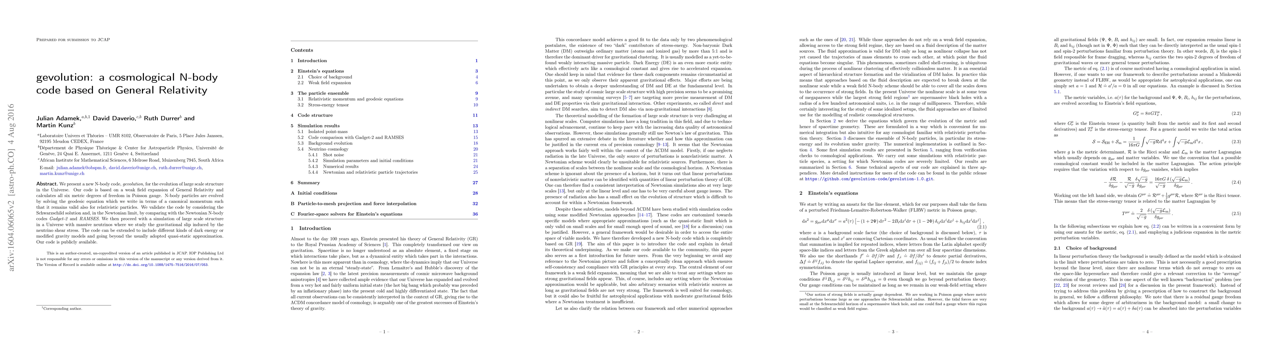 We present a new N-body code, gevolution, for the evolution of large scale structure in the Universe. Our code is based on a weak field expansion of General Relativity and calculates all six metric degrees of freedom in Poisson gauge. N-body particles are evolved by solving the geodesic equation which we write in terms of a canonical momentum such that it remains valid also for relativistic particles. We validate the code by considering the Schwarzschild solution and, in the Newtonian limit, by comparing with the Newtonian N-body codes Gadget-2 and RAMSES. We then proceed with a simulation of large scale structure in a Universe with massive neutrinos where we study the gravitational slip induced by the neutrino shear stress. The code can be extended to include different kinds of dark energy or modified gravity models and going beyond the usually adopted quasi-static approximation. Our code is publicly available.