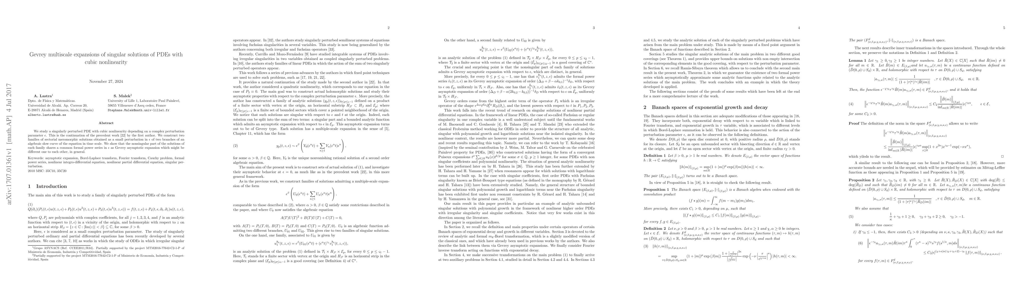We study a singularly perturbed PDE with cubic nonlinearity depending on a complex perturbation parameter $\epsilon$. This is the continuation of a precedent work by the first author. We construct two families of sectorial meromorphic solutions obtained as a small perturbation in $\epsilon$ of two branches of an algebraic slow curve of the equation in time scale. We show that the nonsingular part of the solutions of each family shares a common formal power series in $\epsilon$ as Gevrey asymptotic expansion which might be different one to each other, in general.