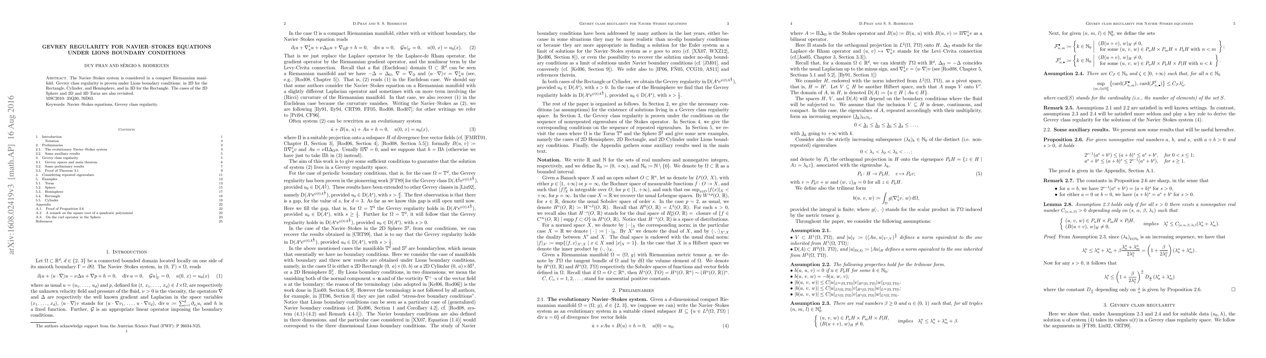 The Navier--Stokes system is considered in a compact Riemannian manifold. Gevrey class regularity is proven under Lions boundary conditions: in 2D for the Rectangle, Cylinder, and Hemisphere, and in 3D for the Rectangle. The cases of the 2D Sphere and 2D and 3D Torus are also revisited.