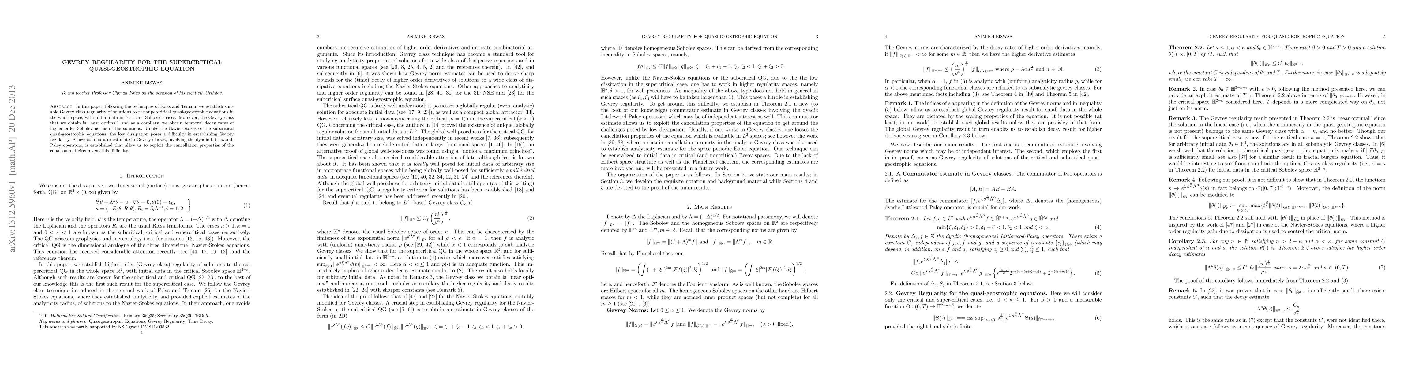 The paper employs techniques from Foias and Temam, focusing on establishing Gevrey class regularity for the supercritical quasi-geostrophic equations in the whole space with initial data in critical Sobolev spaces.