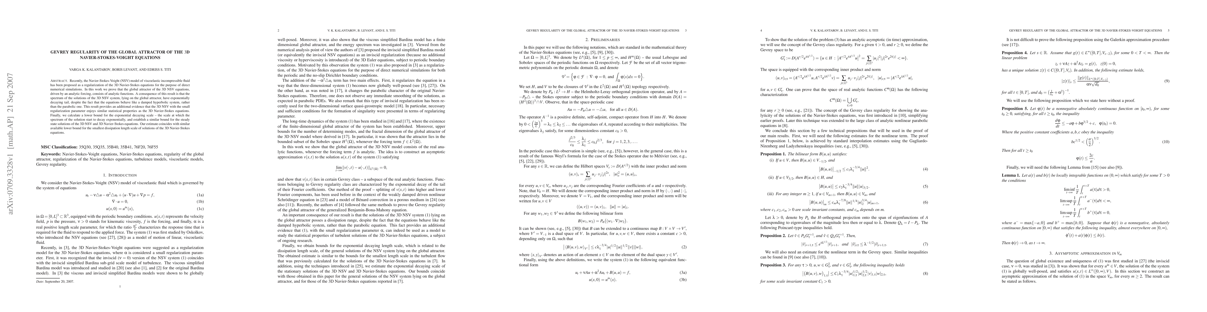 Recently, the Navier-Stokes-Voight (NSV) model of viscoelastic incompressible fluid has been proposed as a regularization of the 3D Navier-Stokes equations for the purpose of direct numerical simulations. In this work we prove that the global attractor of the $D NSV equations, driven by an analytic forcing, consists of analytic functions. A consequence of this result is that the spectrum of the solutions of the 3D NSV system, lying on the global attractor, have exponentially decaying tail, despite the fact that the equations behave like a damped hyperbolic system, rather than the parabolic one. This result provides an additional evidence that the 3D NSV with the small regularization parameter enjoys similar statistical properties as the 3D Navier-Stokes equations. Finally, we calculate a lower bound for the exponential decaying scale -- the scale at which the spectrum of the solution start to decay exponentially, and establish a similar bound for the steady state solutions of the 3D NSV and 3D Navier-Stokes equations. Our estimate coincides with similar available lower bound for the smallest dissipation length scale of solutions of the 3D Navier-Stokes equations.