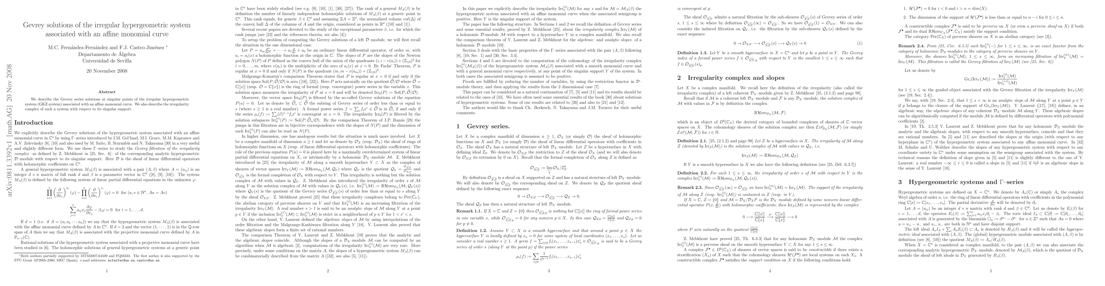 We describe the Gevrey series solutions at singular points of the irregular hypergeometric system (GKZ system) associated with an affine monomial curve. We also describe the irregularity complex of such a system with respect to its singular support. We use restriction and some results in D-module theory to reduce our study to the two dimensional case.